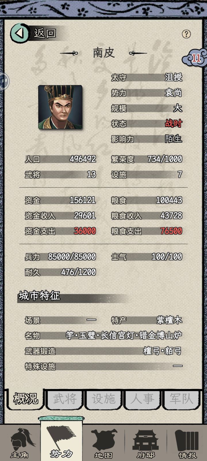 辣鸡袁绍,我打了两个小时终于他打许昌了,结果他喵的他就75000兵力,打不下来,我试了5次都是败北,最终动用修改器才帮他打下来。马上打完的时候我将我的兵力数值又重新改为0了,应该不会影响对局##三国人生模拟器 各位实在想要太守的可以试试这个办法,我是实在没办法了,打了一天都没有太守,晚上看攻略好不容易快有了,结果还没打下来