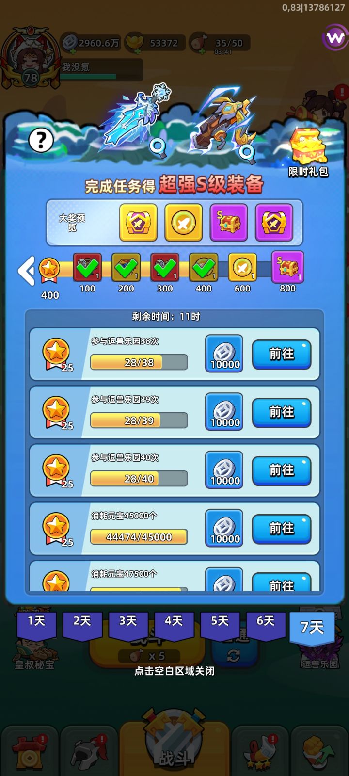 建号首次精兵利器周任务要求1、消耗元宝6W2、垂钓1800次3、斗兽累计1000W分4、消耗元宝抽取装备5次5、丸子或方块消消乐1200分6、参与斗兽40次重点说斗兽次数,斗兽每日只能免费打四次,共七天也就是28次,与任务要求40次相差12次。也就是需要每日6元门票买7天42元,68元斗兽战令买了,在额外买一天18元票,所以任务最低消耗 42+68+18=128人民币,也可以不买