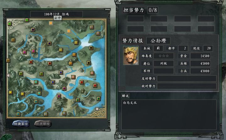 北平太守公孙瓒在原版三国志11游戏玩家们脑海里的印象,就是没有赵云注定得完。尽管公孙瓒的个人能力,放在群雄割据的各路诸侯里不算差的,然而白马特技也远不足以助他逆天改命。要是各位当年玩白马义从意犹未尽,或者还想体验更加真实的白马精锐,那么还是强烈建议来玩玩三国志11惊鸿版。对于很多二三流势力和角色来说,确实是惊鸿再造!惊鸿版的公孙瓒势力,开局得到了两座城池作为根据地。其一,是西北方向新增了居庸关