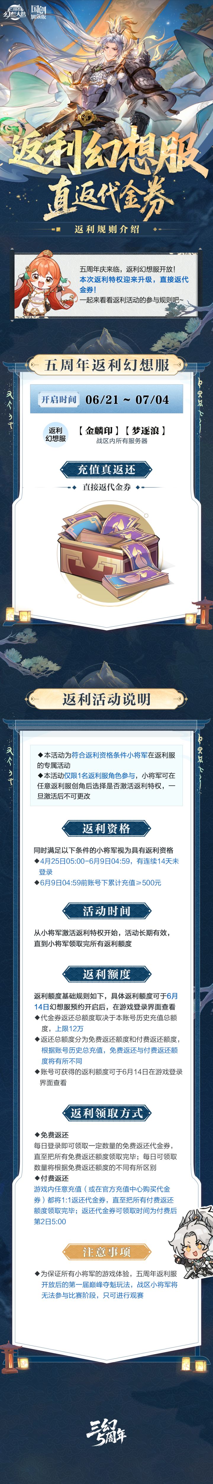 【重回群星闪耀时,恭迎姜天帝归位】6.21新魂将「皓麟姜维」携全明星幻想服上线 若天命无常,那便让我来修正这一切。 抹杀所有不忠大汉者,重铸汉室,解救苍生。 维此身,只为守护而战! ——五周年庆典开启,6.21全新魂将【皓麟姜维】携「全明星幻想服」上线,恭迎姜天帝归位!—— ※【皓麟姜维】混伤爆发型大C,攻击三段式升级,巨幅增伤,越打越强,主宰全场输出!参与活动即送。 ※【全明星幻想服】五周年幻想