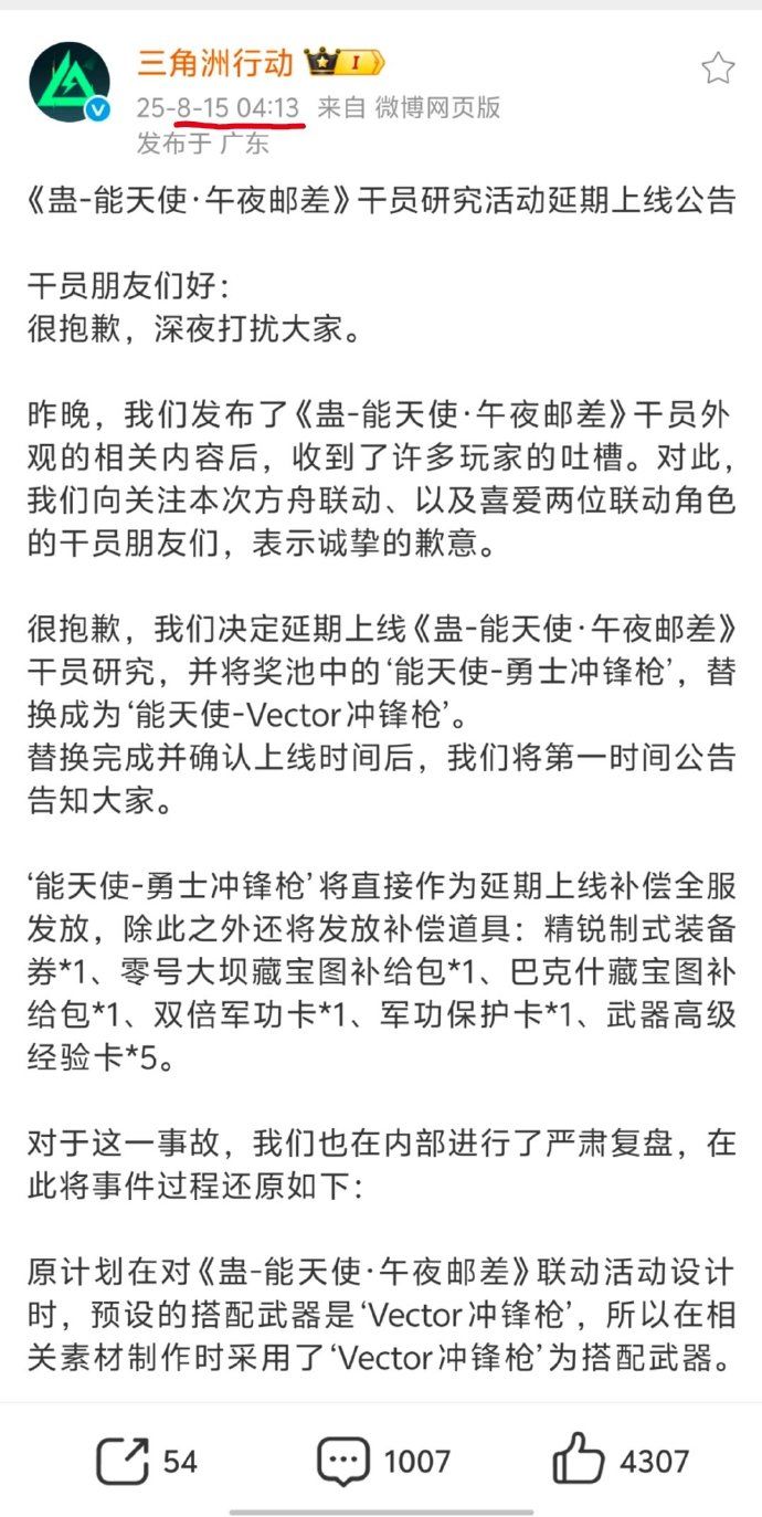 干员朋友们好:很抱歉打扰大家。昨晚,我们发布了《蛊-能天使·午夜邮差》干员外观的相关内容后,收到了许多玩家的吐槽。对此,我们向关注本次方舟联动、以及喜爱两位联动角色的干员朋友们,表示诚挚的歉意。很抱歉,我们决定延期上线《蛊-能天使·午夜邮差》干员研究,并将奖池中的‘能天使-勇士冲锋枪’,替换成为‘能天使-Vector冲锋枪’。替换完成并确认上线时间后,我们将第一时间公告告知大家。‘能天使