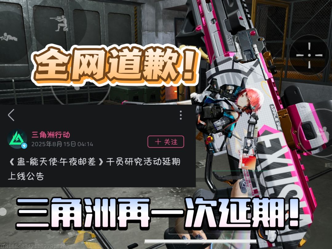 联动定档延期,《三角洲行动》道歉,勇士冲锋枪皮肤免费送【事件背景】8月14日下午5点左右,《三角洲行动》发布蛊 X 能天使·午夜邮差联动短片并官宣将在8月15日9点上架联动内容【能天使·午夜邮差】联动系列活动时间:8月15日9点至9月28日24点活动内容:能天使·午夜邮差-蛊外观、能天使·午夜邮差-勇士冲锋枪、挂饰、手表、动作、名片、喷漆、专属定制语音等多项物品兑换要求:三角券/三角币