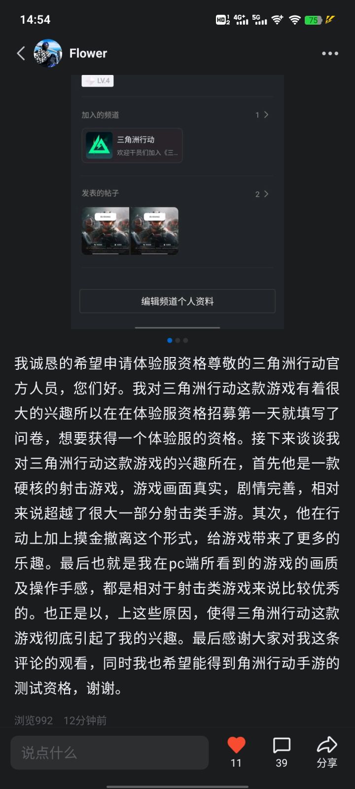 点击链接查看QQ频道帖子【我诚恳的希望申请体验服资格尊敬的三角洲行动官方人员,您们好】:https://pd.qq.com/s/5auv5s0jf?shareSource=5#三角洲官方