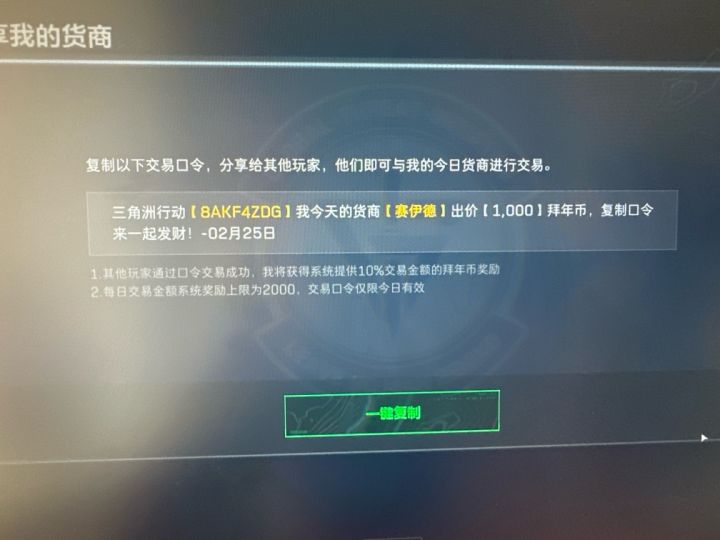 三角洲行动【8D0VAFCL】我今天的货商【赛伊德】出价【1,100】拜年币,复制口令来一起发财!-02月17日#三角洲赛伊德