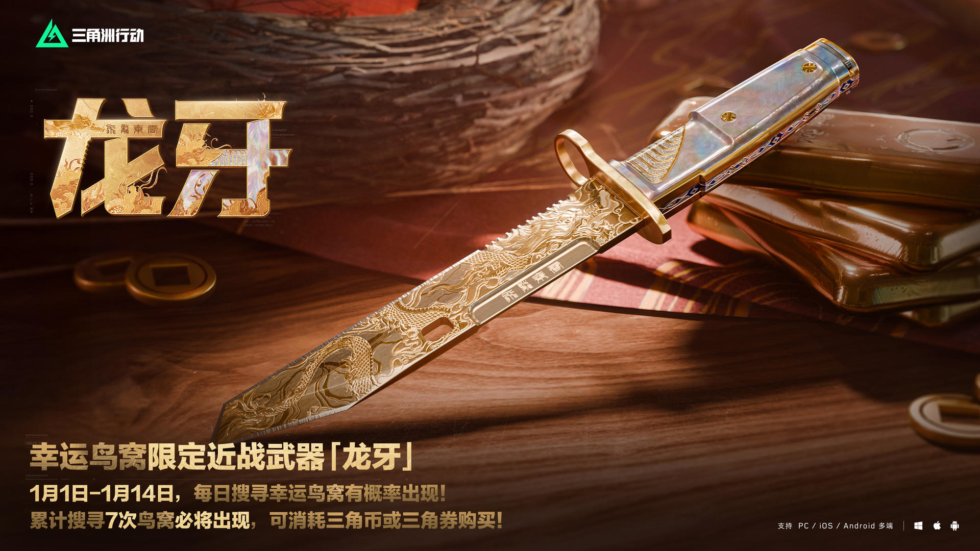 1月1日-1月14日,幸运鸟窝全新限定近战武器「龙牙」登场! 龙牙是一把短小精悍的直刀,通体的鎏金龙纹,配备独特的攻击动作、收刀动作及全新的检视动作,尽显锋芒。 每日搜寻幸运鸟窝即有概率出现,累计搜寻7次鸟窝时必将出现,并可消耗三角币或三角券购买!