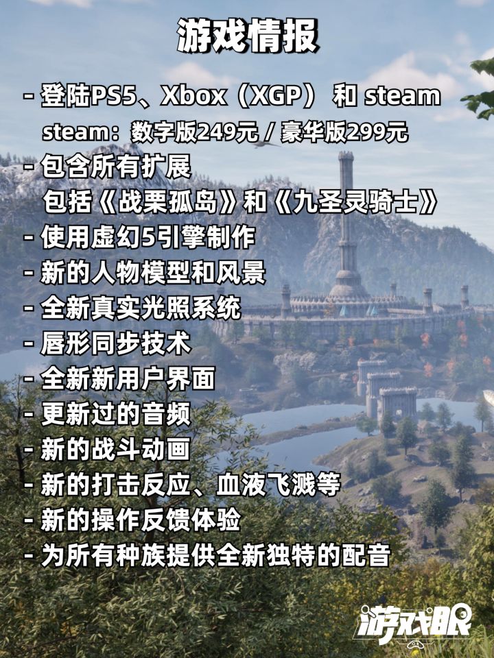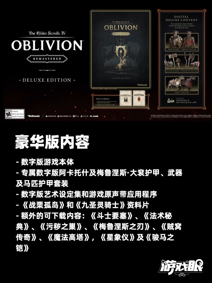 《上古卷轴4:湮灭复刻版》 现已在Xbox Series X | S、PS5、PC上发售,首发XGP。游戏标准版与豪华版《上古卷轴4:湮灭重制版》标准版价格:249包含本体游戏+两个故事资料片:《战栗孤岛(Shivering Isles)》《九圣灵骑士(Knights of the NIne)》收录其他可下载内容:“斗士要塞(Fighter’s Stronghold)” 资料片“