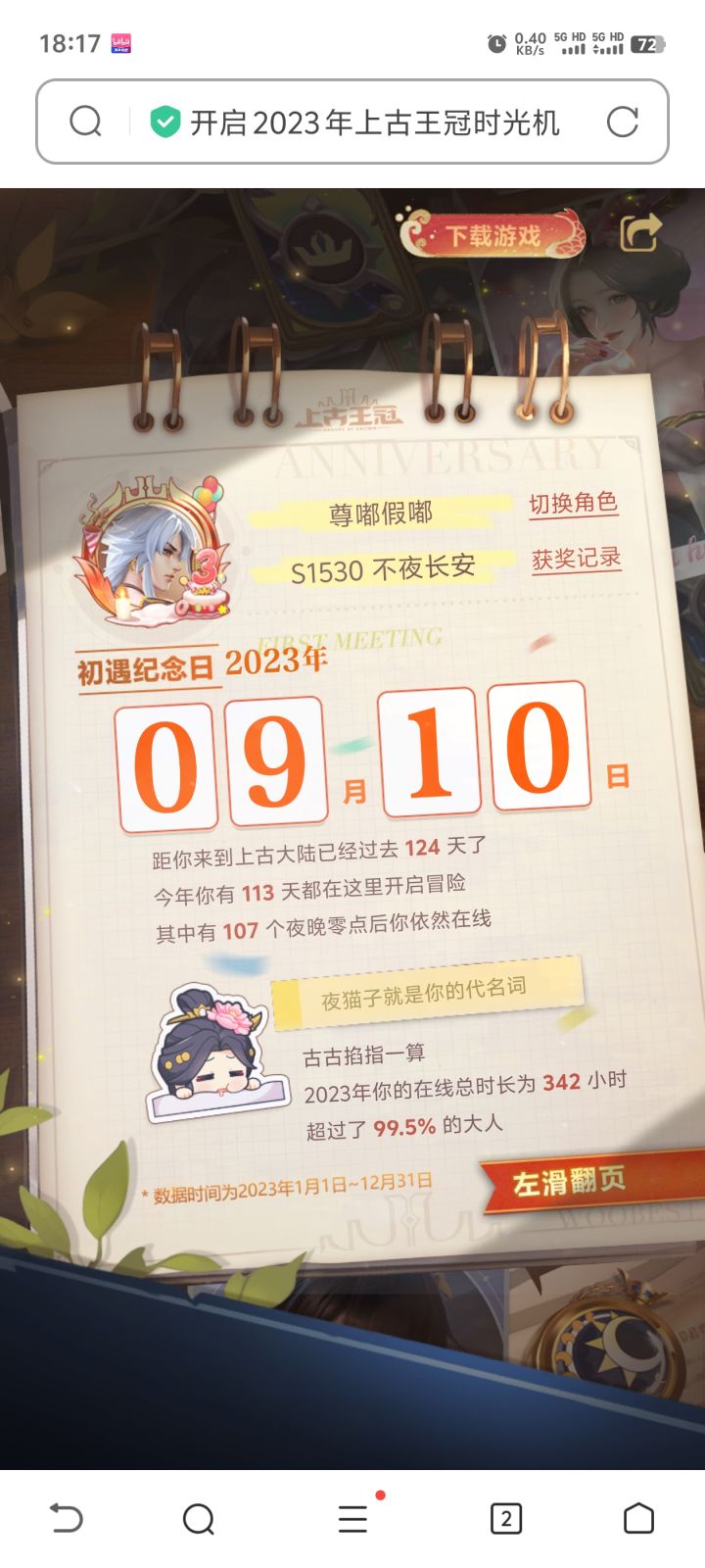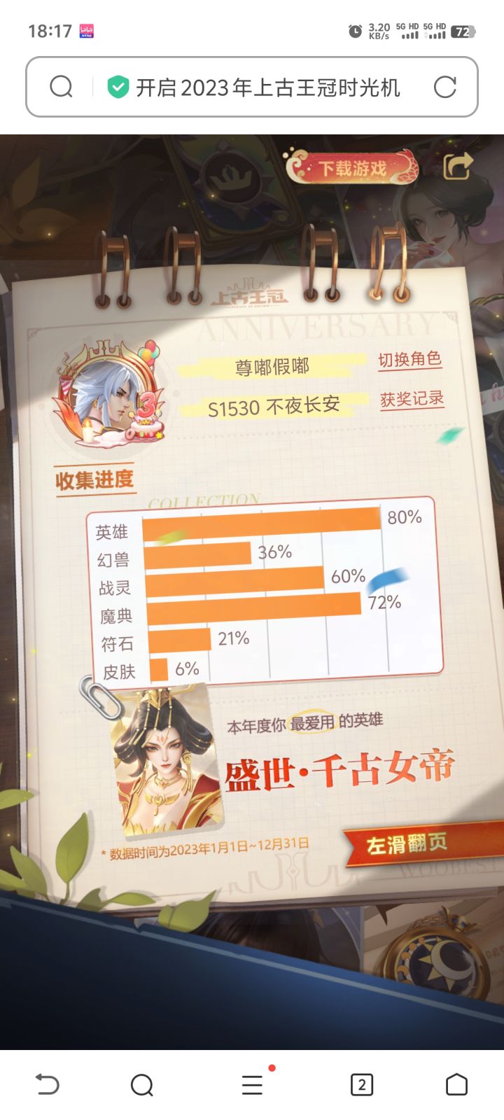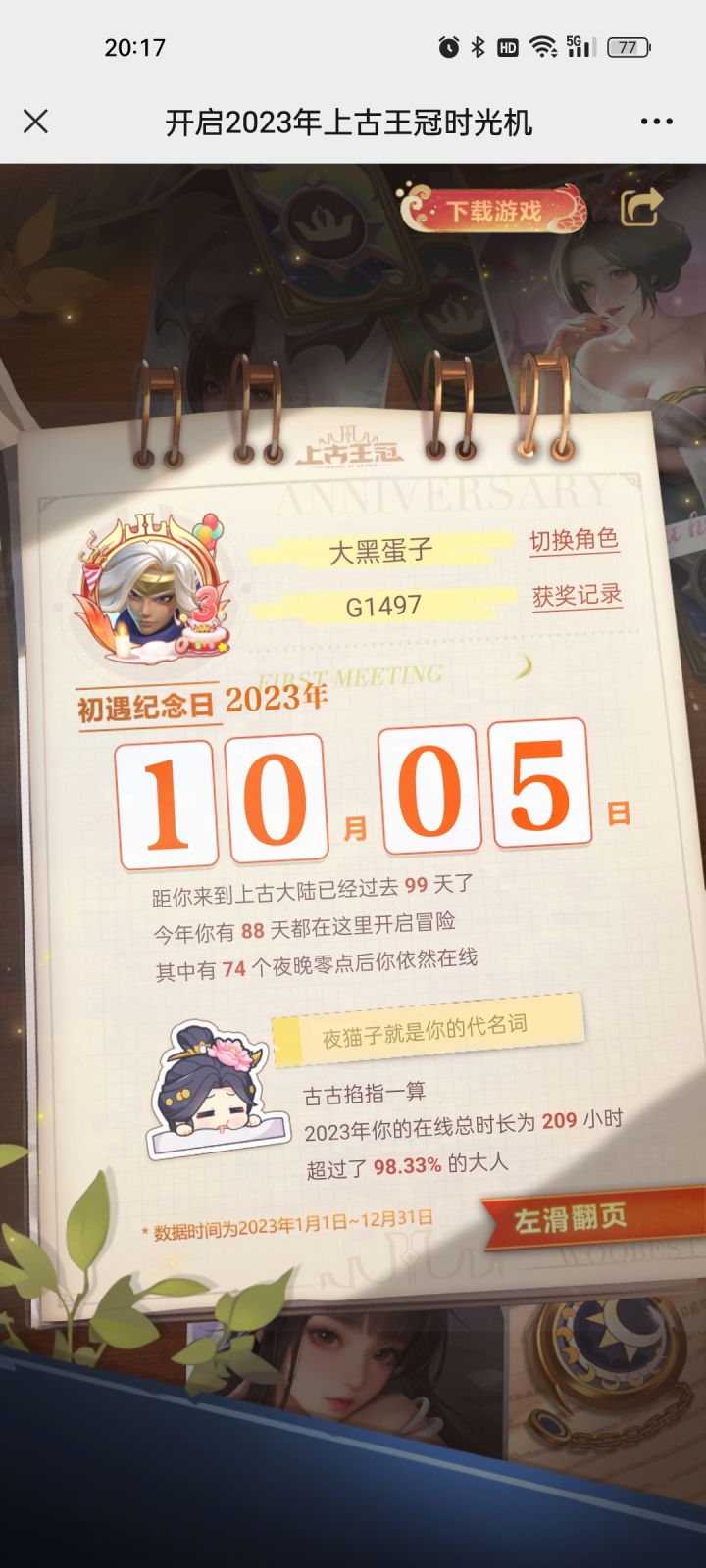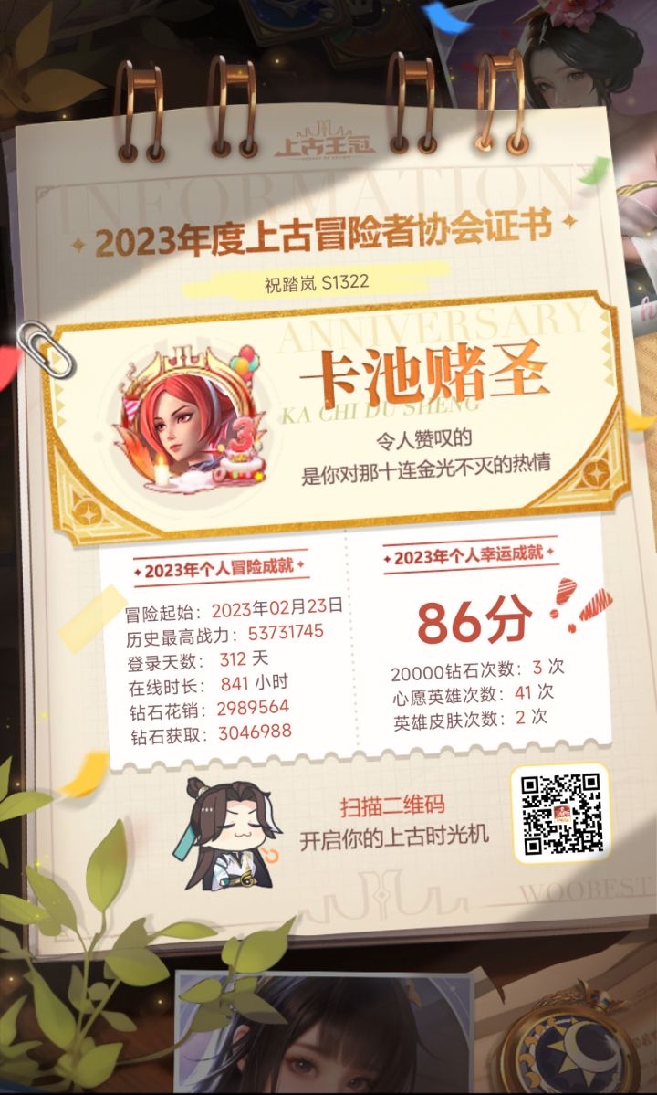 17242203107自从前年上了上古这条船以后,至今仍然没弃。一年多来,由原来只有一个长期玩的号变成了三个。有时候,我也在想,这难道是所谓的“真爱”?坦白说,我是很期待时光机的。因为可以看到自己一年来的付出和收获。一年了,原来经历了这么多!大部分人关注点在两万钻石的获取次数上,我也很关注。但我更在意的是游戏总时长。因为这可以看出上古占用了我们多少宝贵的生命。很遗憾,我属于被占用比较多的,我惭