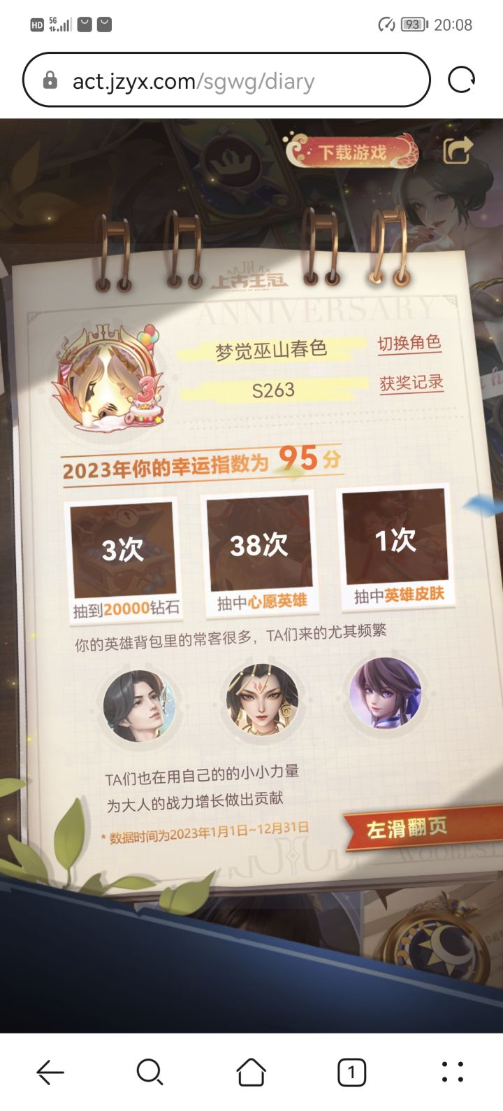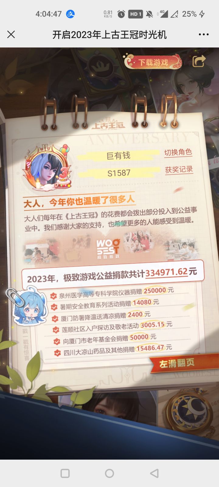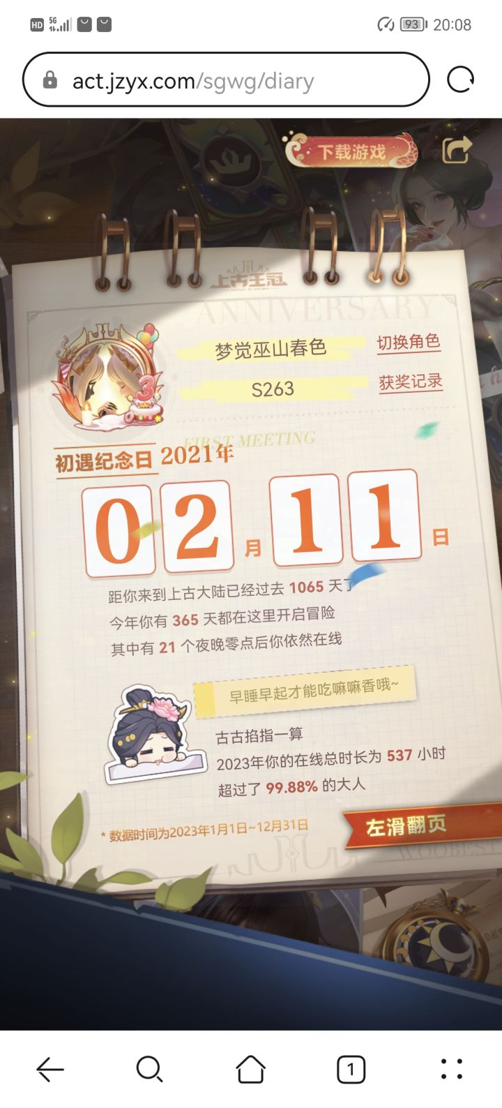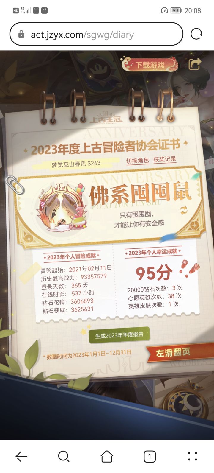 17242203107自从前年上了上古这条船以后,至今仍然没弃。一年多来,由原来只有一个长期玩的号变成了三个。有时候,我也在想,这难道是所谓的“真爱”?坦白说,我是很期待时光机的。因为可以看到自己一年来的付出和收获。一年了,原来经历了这么多!大部分人关注点在两万钻石的获取次数上,我也很关注。但我更在意的是游戏总时长。因为这可以看出上古占用了我们多少宝贵的生命。很遗憾,我属于被占用比较多的,我惭