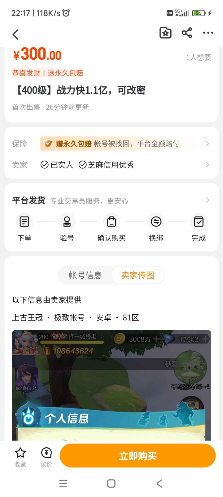 下载下来一看里面都是出售游戏账号的,上古王冠也有。1个多亿的账号竟然才300块,这不纯纯的当垃圾卖么?亏我当初还充了差不多2000块,建议极致公司去交涉下这属于恶意低价扰乱市场。逛了游戏账号交易市场才发现,上古充十万八万比比皆是。#上古王冠#上古王冠周年庆#上古王冠萌新
