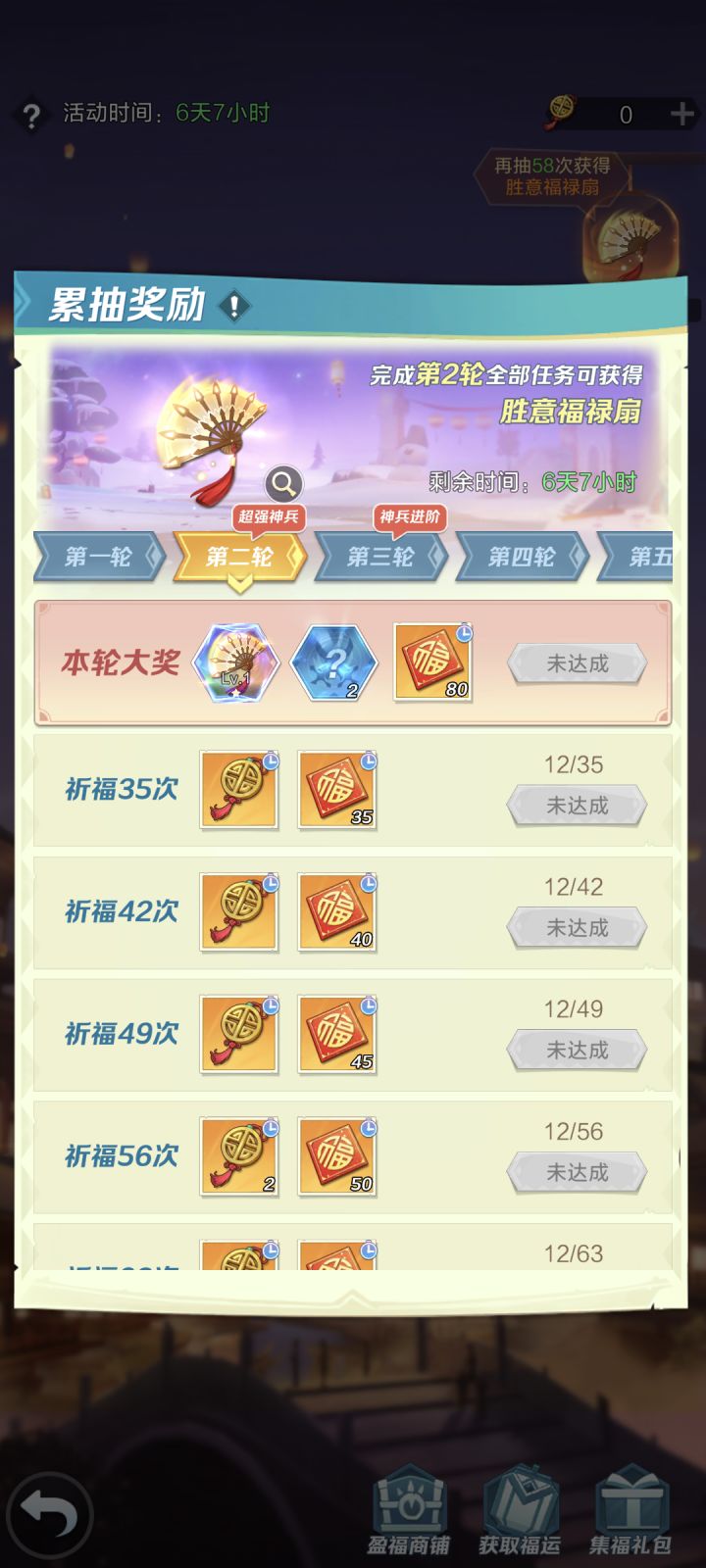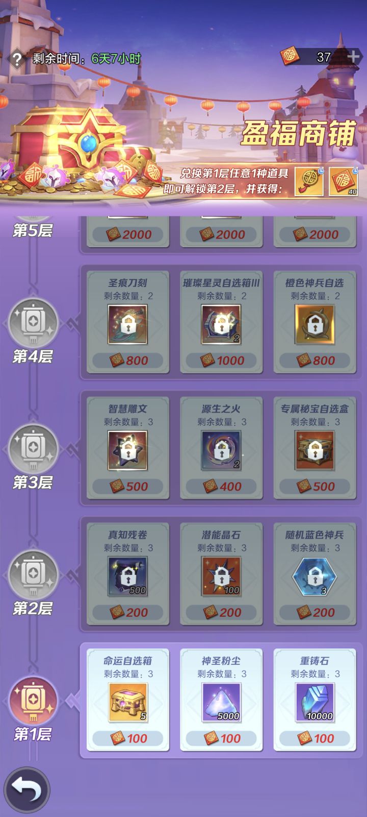 新春活动——花灯集福系统【福运缘结】:“花灯集福”抽奖道具;获取:白嫖任务15个,两万钻买30个。【新春福字】:“盈福商铺”代币;获取:抽奖一次给一个,累抽额外赠送。盈福商铺:买一层中的一个解锁下一层,解锁额外赠送抽奖数和代币。建议玩法:①只白嫖不花钻,抽完19次走人②想拿新神兵的:两万钻+¥60 备注:①不是很建议花两万钻,前两层商铺东西不值两万钻,除非抽奖很欧②不是很建