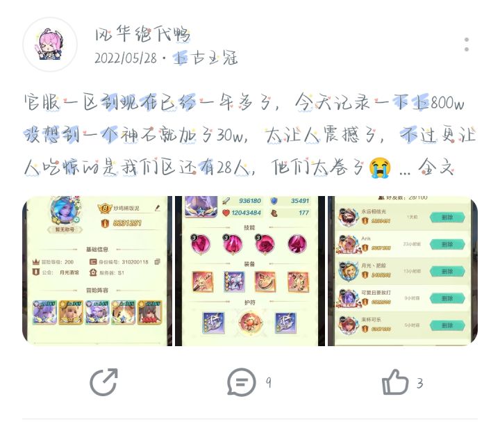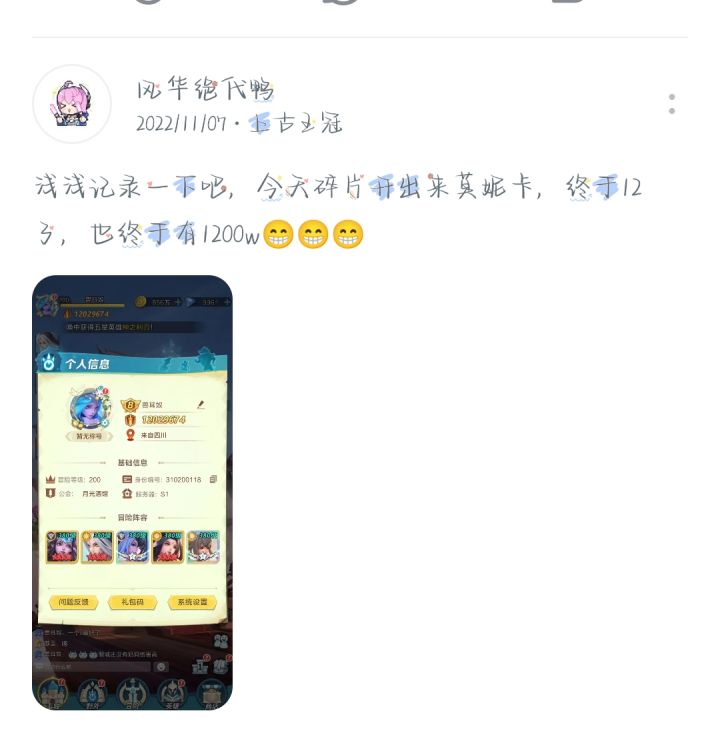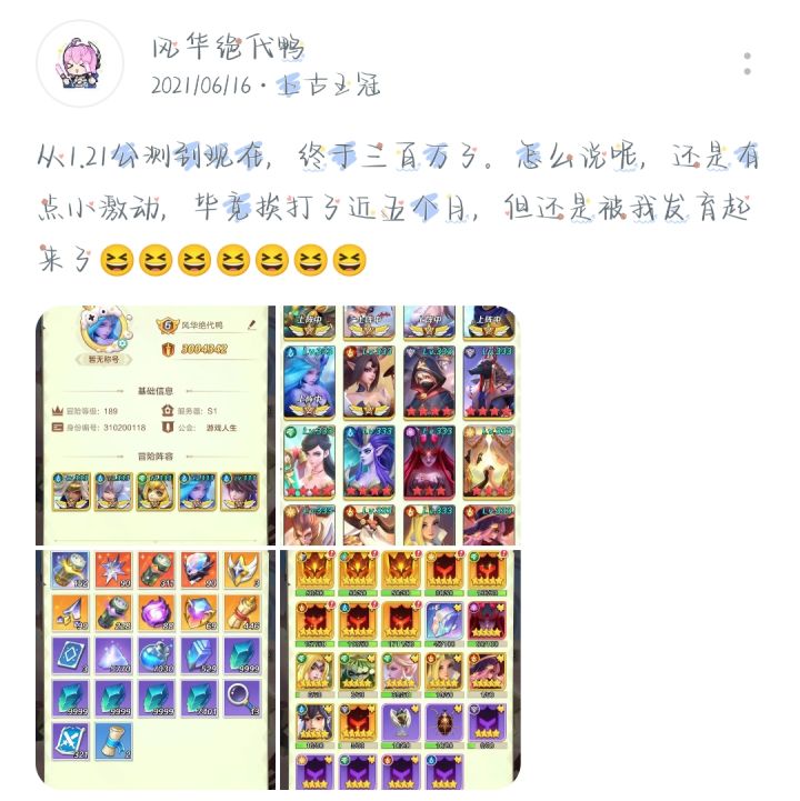 编号:310200118说个大实话,有的玩家熬走了俩代策划,原来是我们这种骨灰级玩家啊。算算时间,还有俩个月就是王冠三周年生日咯!!!在这里感谢王冠陪伴了我大半个大学生活,希望以后工作的日子里也能有你相随。最后祝愿上古王冠的工作人员万事如意,心想事成#上古王冠游戏时长