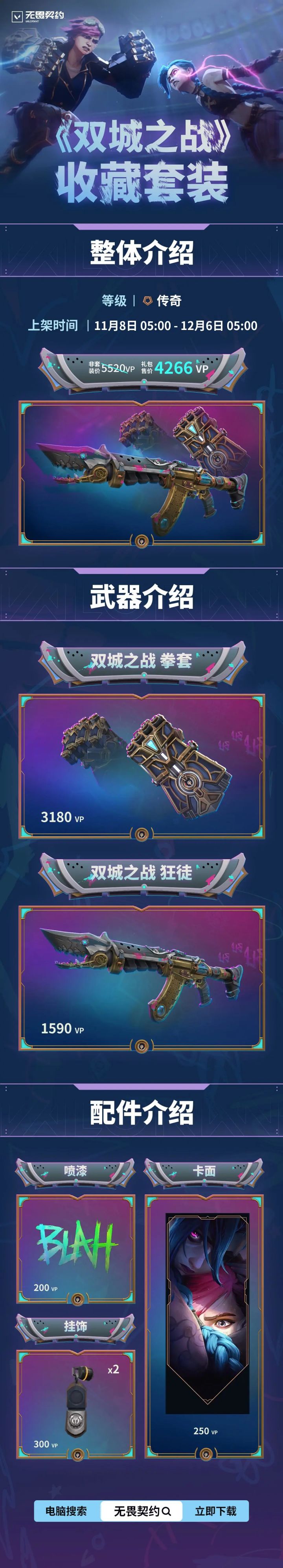 双城之战收藏套装:11月8日与众不同,让你强大!无畏契约官方发文宣布《双城之战》收藏套装即将上线:铁拳冲撞,炮火纷飞!收集『双城之战』系列拳套、狂徒以及喷漆、卡面、挂饰,尽情感受海克斯科技的疯狂之力吧!『双城之战』收藏套装,11月8日与众不同,让你强大!#上海大学电竞社 #上海大学 #无畏契约