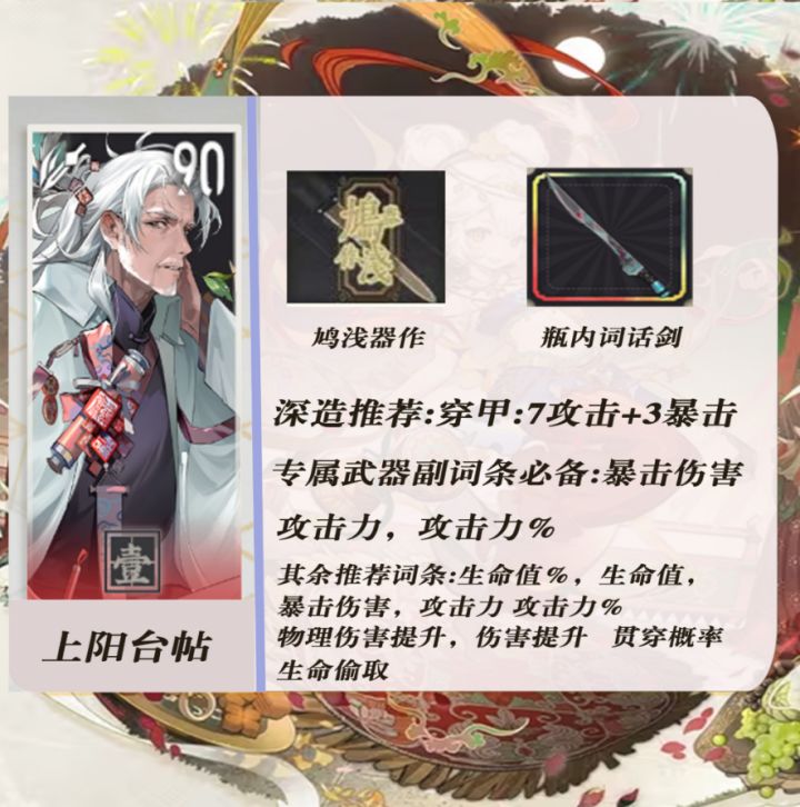 人物:上阳台帖(上阳,老爷子,大叔)推荐抽取0命指数: ⭐⭐⭐推荐抽取3命指数: ⭐⭐推荐抽取6命指数: ⭐⭐(6命效果:连击伤害提升20%)技能介绍: 常击(0消耗):对目标单体造成1.0倍率的物理伤害(倍率根据该器者的感应度的等级升高而提升)。 职业技能(0消耗):使用后自身可再行动一次,再行动的移动格子数减少2格,冷却时间2回合。 绝技(3消耗):使用绝技时增加自身暴击概率1