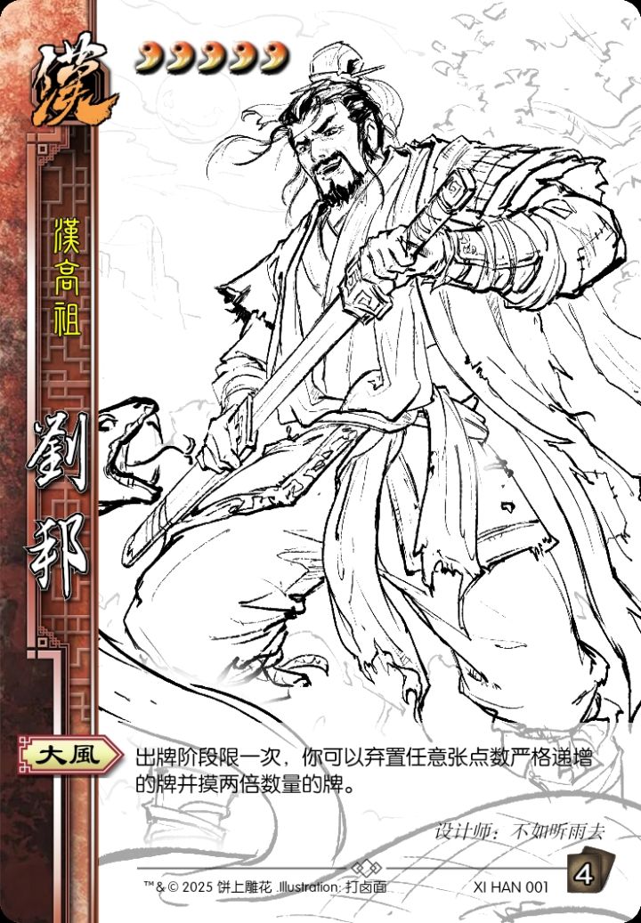 欢迎来到听雨的个人自设武将扩展包【饼上雕花】系列专栏!本扩展包包括但不限于《代号杀》官方武将个人向改将和番外包个人DIY。扩展包整体强度体系以本包为准,不考虑上线《代号杀》游戏(如果有机会上线的话)的实际强度。“大风起兮云飞扬,威加海内兮归故乡,安得猛士兮守四方!”刘邦 5勾玉5手牌上限势力:西汉称号:汉高祖设计师:不如听雨去画师:打卤面大风歌:出牌阶段限一次,你可以弃置任意张点数