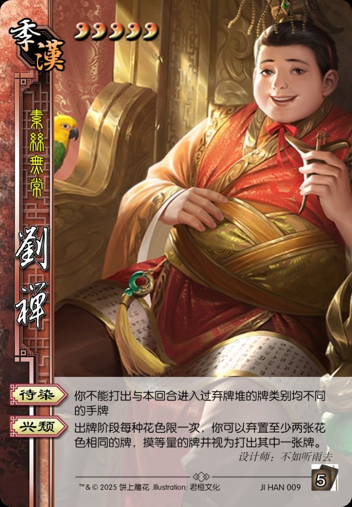 欢迎来到听雨的个人自设武将扩展包【饼上雕花】系列专栏!本扩展包包括但不限于《代号杀》官方武将个人向改将和番外包个人DIY。扩展包整体强度体系以本包为准,不考虑上线《代号杀》游戏(如果有机会上线的话)的实际强度。与官方武将相比,该扩展包的武将体力上限与手牌上限之和改为10而非官方的9“评曰:后主任贤相则为循理之君,惑阉坚则为昏暗之后,传曰"素丝无常,唯所染之",信矣哉!礼,国君继体,逾年改元,