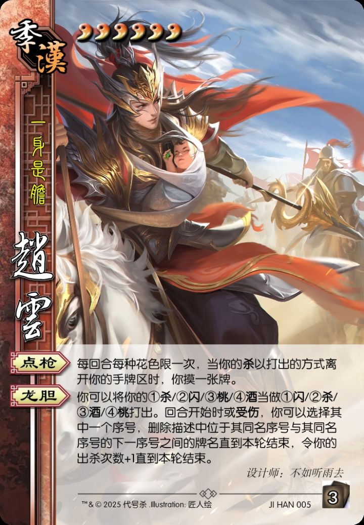 各位好,这里是听雨的代号杀DIY改将专栏:赵云 6勾玉3手牌上限 势力:季汉称号:一身是胆设计师:不如听雨去画师:匠人绘枪出如龙:每回合每种花色限一次,当你的杀以打出的方式离开你的手牌区时,你摸一张牌。一身是胆:你可以将你的杀/闪/桃/酒当做闪/杀/酒/桃打出。回合开始时或受伤,你可以选择其中一个序号,删除描述中位于其同名序号与其同名序号的下一序号之间的牌名直到本轮结束,令你的出杀次