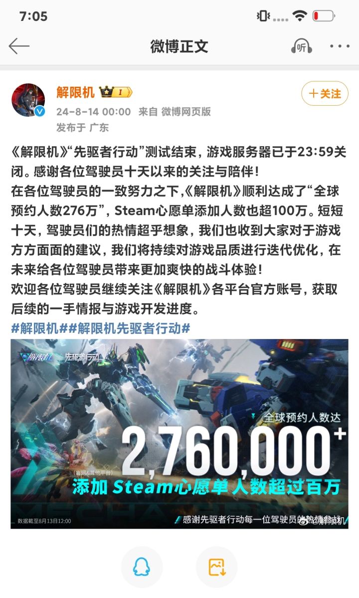📢 就在今天!7月2日12点,《解限机》全球公测火爆开启! 官网/Steam火速下载,加入机甲大战! 🔥 S0赛季燃爆上线! 酷炫限定武装! 六大机兵专属“炽燃系列”登场,火焰爆裂设计,拉风又稀有! 海量新内容! 新机兵、新地图、新玩法同步更新,体验大升级! 🤖 15台机甲首发,零门槛开爽! 格斗、狙击、支援...多样机甲任你选,轻松上手! 开服福利! 飞景、地狱火等3台强力机甲,限时7天免费玩!