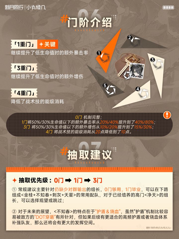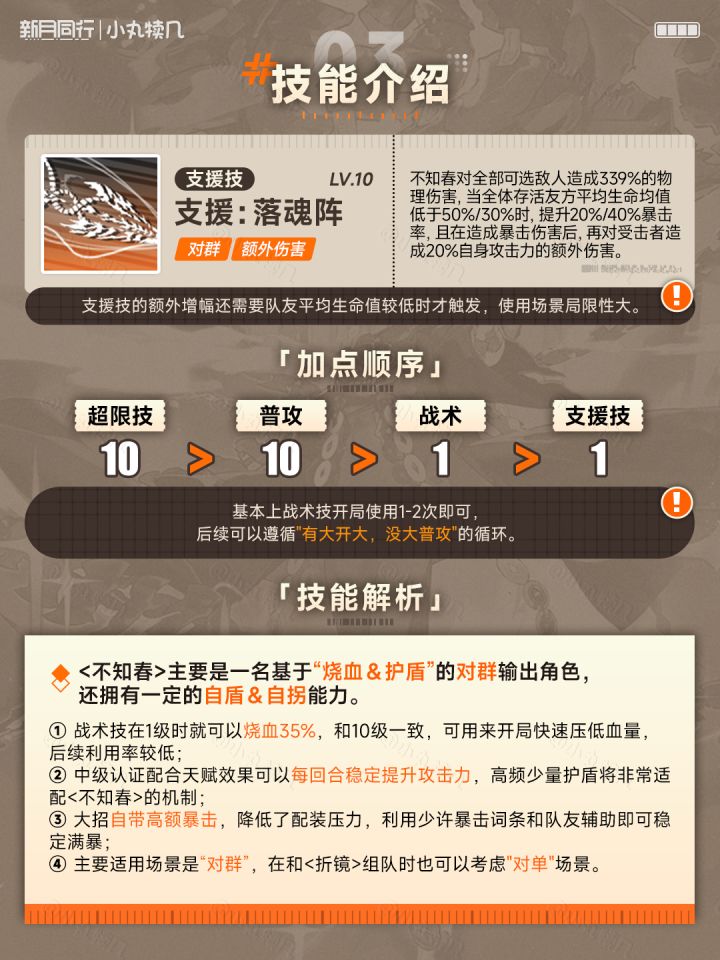 #新月同行他者的集会 #新月同行 #新月同行攻略 #游戏种草计划 #不知春tada~这里是小丸!新月同行的1.1.1版本大家体验的如何啦,糖水铺和拧螺丝都通关了吗?本期带来的是常规轮换卡池角色的养成攻略!角色:『不知春』星级:☆☆☆☆☆☆灵感:强攻&情阵营:全联堂定位:对群输出&烧血&护盾1⃣角色定位2⃣养成材料3⃣卡带推荐4⃣技能解析5⃣设施专长6⃣认证介绍7⃣抽取建议8