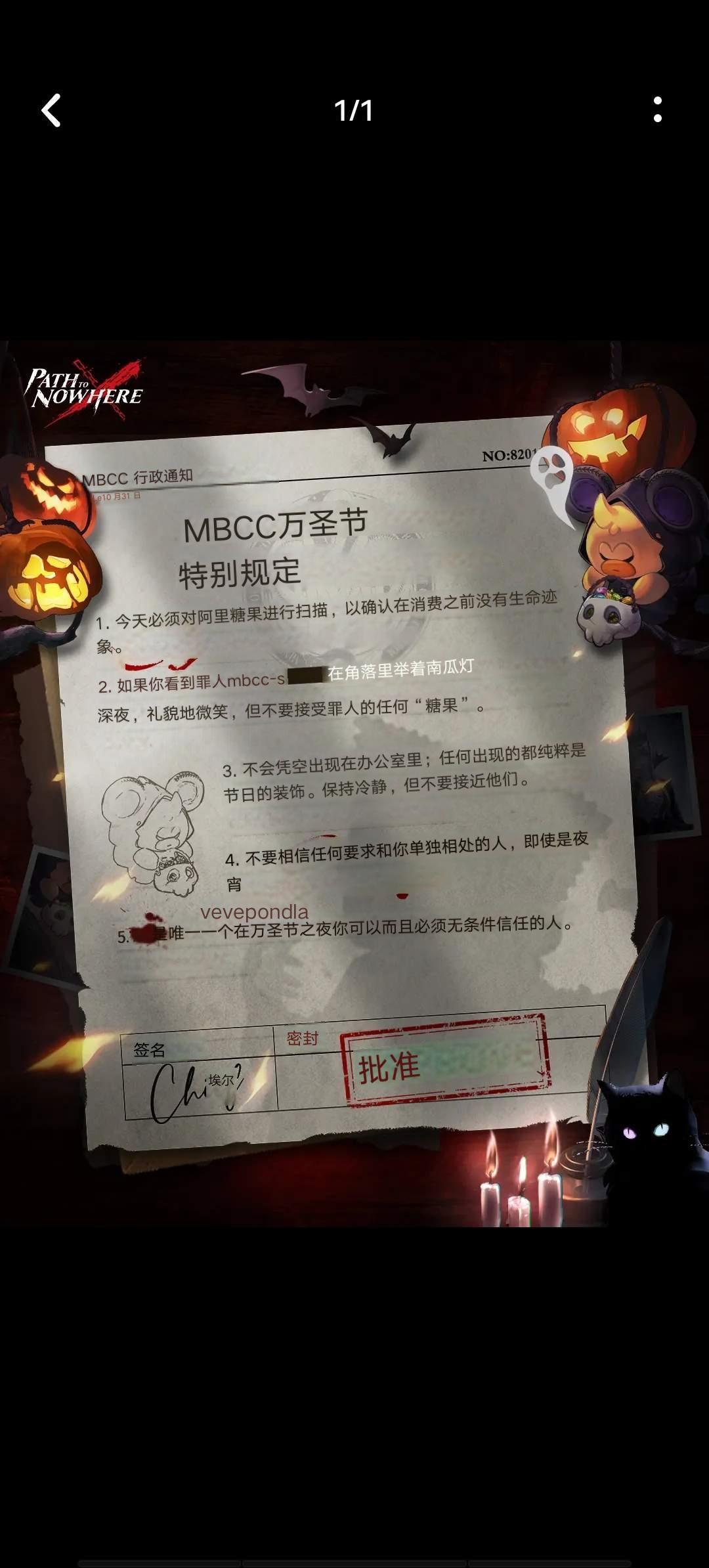 无期迷途MBCC 行政通知编号:8201日期:10月31日 MBCC万圣节特别规定 1. 今日收到的所有糖果,食用前必须扫描确认无任何生命迹象。2. 若深夜看到罪徒MBCC - S████手持南瓜灯在角落,礼貌微笑即可——但切勿接受该罪徒的任何“糖果”。3. 局内不会有无故出现的鬼火;若有,纯属节日装饰。保持冷静,切勿靠近。4. 任何人要求与你独处,都不可信任——包括副官南汀也