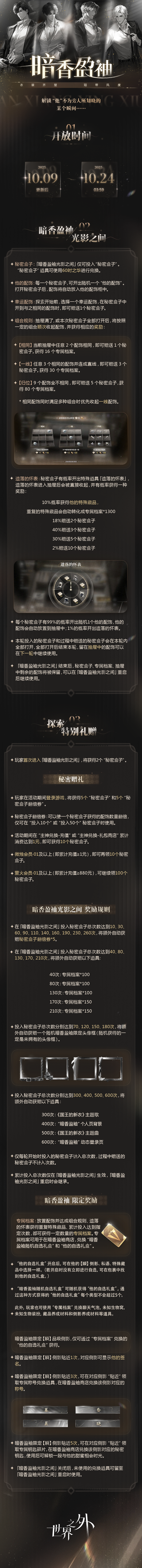 光影之间,他不为常人所晓的一面,悄然浮现…… ✦开放时间✦ 2025年10月9日更新后-10月24日03:59 ✦暗香盈袖光影之间 · 规则简介✦ 在「暗香盈袖光影之间」投入“秘密盒子”,即可开出“他的配饰“,放入配饰柜中,可根据一定的组合顺次,解锁特别奖励。 (“秘密盒子”道具可通过秘密赠礼或使用60时之华兑换获取。) · 【相同】任意2个相同配饰,即可赠送1个秘密盒子+16个专属档案。#世界之外