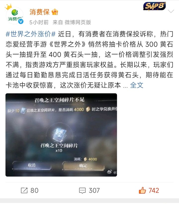 7月23日9:45到10:00期间,《世界之外》服务器更新,同时还为发放闪断补偿。原本玩家们以为这只是一次正常的更新,想不到,打开游戏后,抽卡变成400一抽。 一觉睡醒的玩家10连抽完,看清价格后:世界之外也喜提消费者投诉n份随后在当天晚上7点48分,世界之外也发布道歉声明。诶,由于“刹那”侧影的价值特殊,叽里呱啦叽里呱啦,所以涨价,再由于没有及时的通知定价,所以给补偿了仨瓜俩枣(召唤之