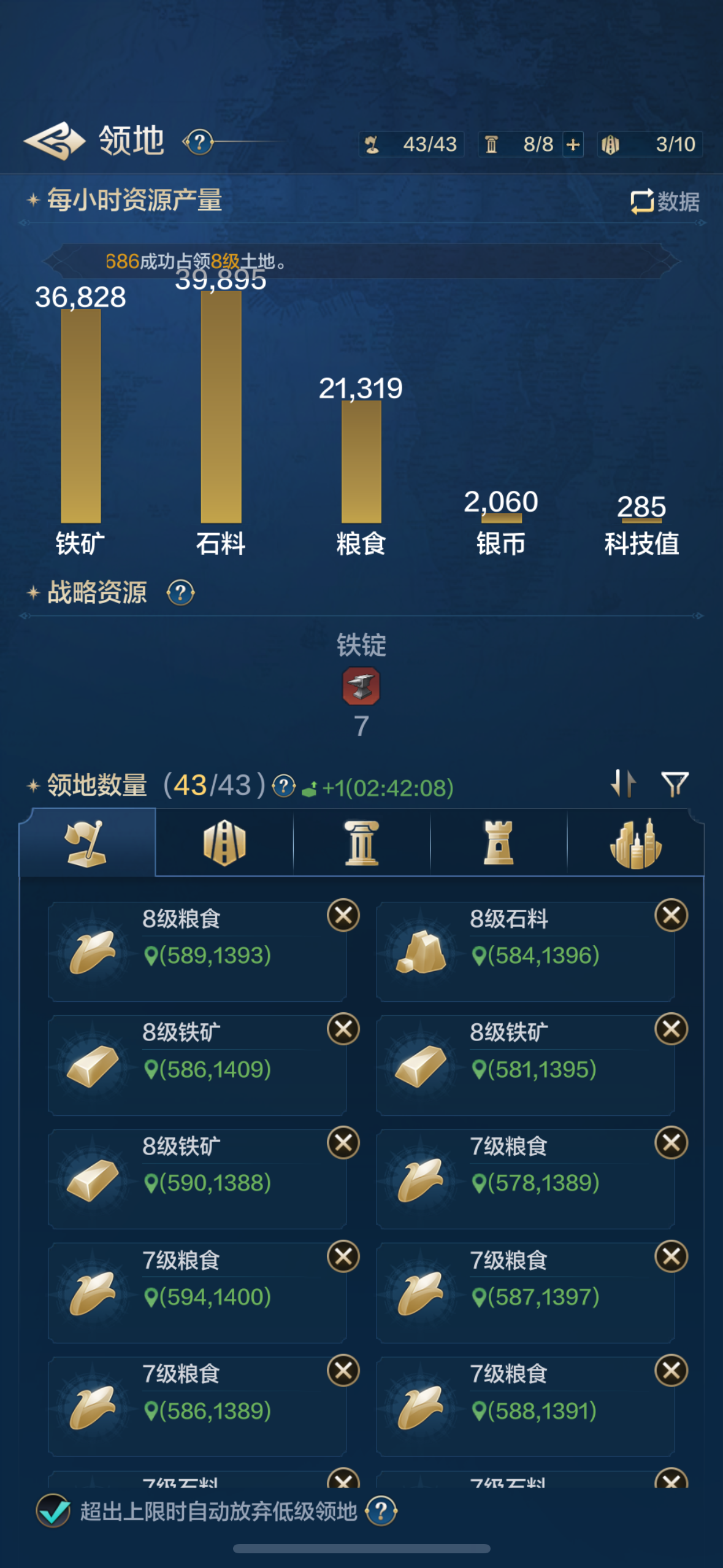 Ⅰ开局篇①选择华夏文明开局,征兵消耗减少②前期根据指引不断完成左侧任务直到因为缺少石料资源卡住开荒进度③然后右下角-交易商会-把粮食换成石料/消耗行政点开垦1次石料地,继续做主线到12章④12章以后主要以升科技值和开分城为科技树的主要目标,以1队能够开7级遗迹为目标进行遗迹的改良/换地。⑤城内建筑需要消耗石料和铁矿,其中石料前期比较缺,不打架,粮食会暂时溢出,可通过-交易商会-进行资源