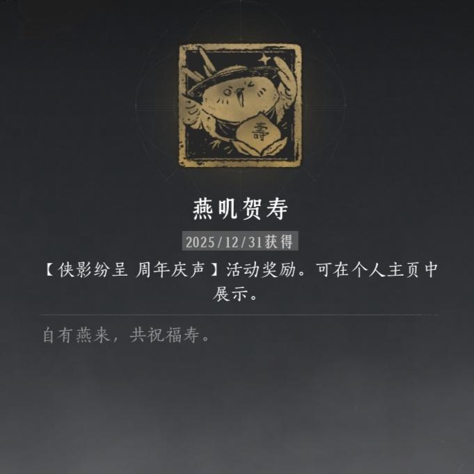 🍂“自有燕来,共祝福寿。” 获取途径:“侠影纷呈 周年庆声”活动【参加“侠影纷呈,周年庆声”活动,累计做任务达到一定积分即可获取徽章(详情可小🍠或AC站搜“燕云十六声”查看活动)活动时间:2025.12.27-2026.01.08🪶Tips. *活动需要做任务进行抽奖,稍微有些麻烦,基本需要做三四天才可以拿到徽章奖励【任务也比较繁琐,需要累计发