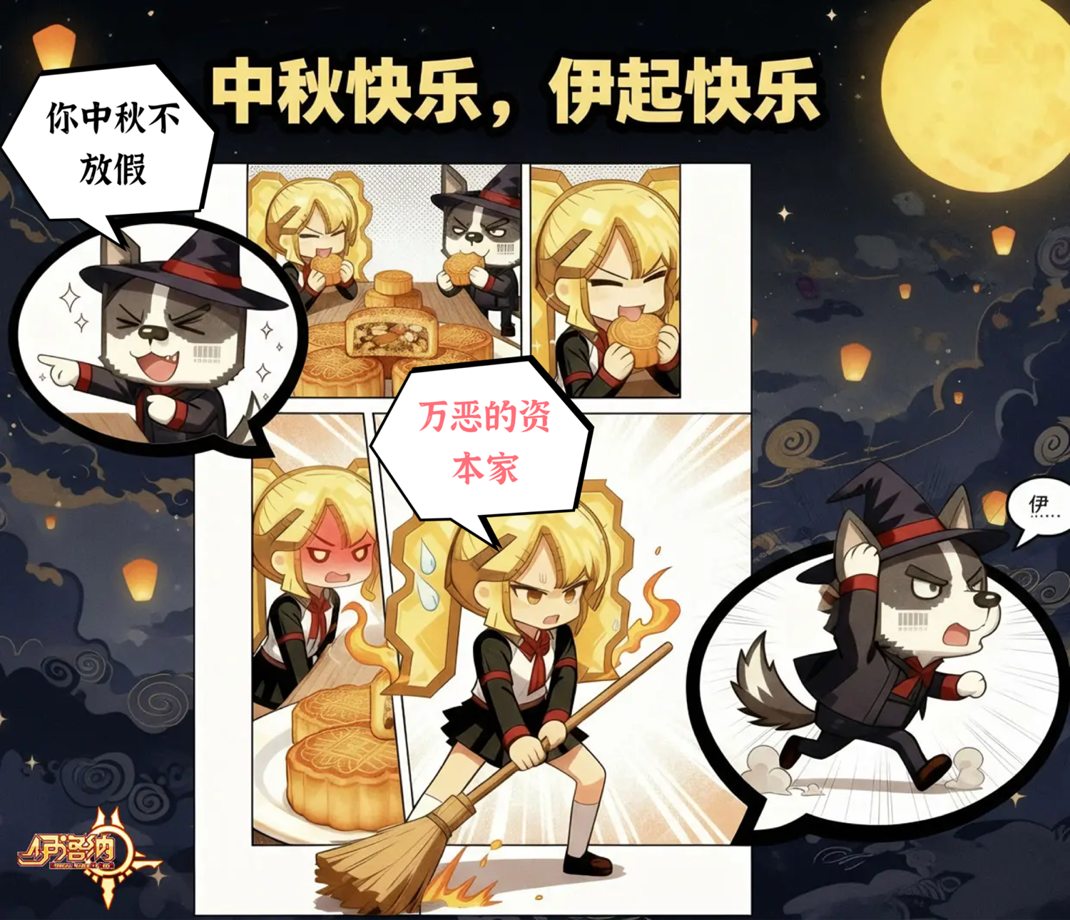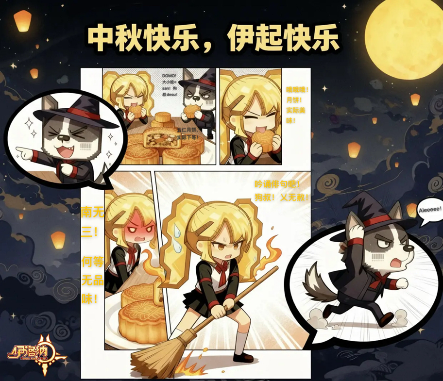 桂香绕庭月满楼,扫把追犬乐未休。此夜团圆非寻常,伊尔瓦境写春秋。 冒险者公会的庭院里,桂香如瀑,泻满一地金黄。圆月当空,长桌上月饼堆成小山,伊洛纳的冒险者们围聚一堂,欢声如潮。 人群中央,狗叔傲然蹲于最显眼的五仁月饼旁,尾巴盘成一道固执的圆弧,镜片后的目光锐利如侦测敌情的哨兵。 --- 大小姐端着一碟油光润泽的莲蓉月饼翩然而至,见状轻笑:“狗叔,你这般严防死守,莫非这五仁月饼里藏了‘堕落方舟’的攻