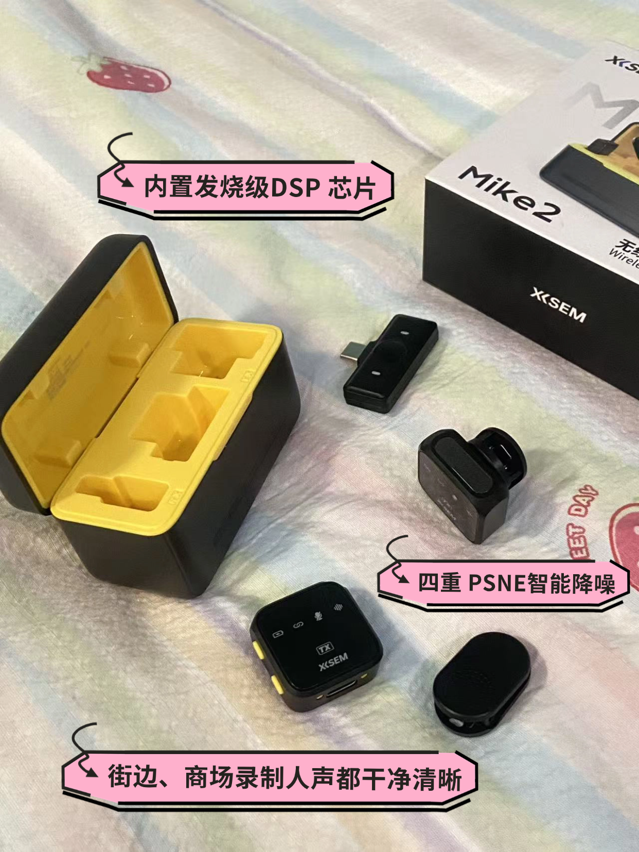 西圣Mike2无线领夹麦克风一定要拥有姓名!!!🎤 — 磨砂黑的外观 小巧精致 一夹就稳 10克重量轻到像没戴过 礼盒包装配件也很齐:接收器、充电仓、磁吸背夹 真的是开箱就能用 还敲方便! — 48kHz/24bit高精度采样70dB信噪比 人声还原干净自然 细节清晰到位✨ 内置定制6mm镀镍音头 录出来像棚里一样稳 四重PSNE智能降噪+发烧级DSP芯片 马路上、咖啡厅背景声