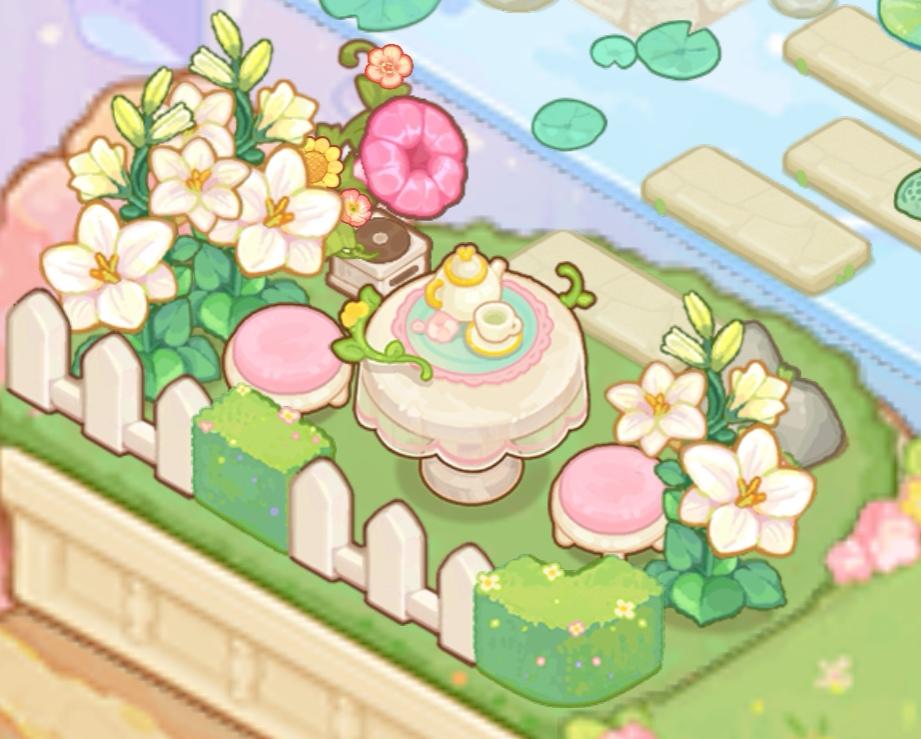 很适合来一场茶话会~蔷薇圆凳,甜茶矮桌,百合花×3,牵牛花留声机,雾岚石,尖尖栅栏(长),造型灌木墙(短),造型灌木拐角#乌冬的旅店花园