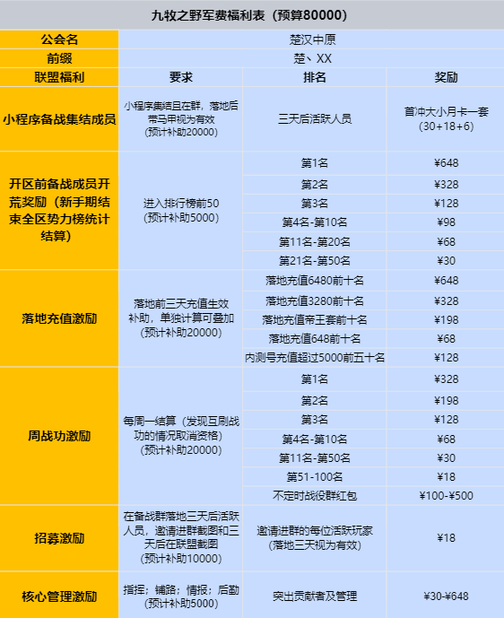 联盟福利 1.管理每个月包大小月卡 2.开服一周后开启 每日攻城总贡献和战功第一各奖励首充*1 ,当天现结 (由副盟主六幺负责截榜,只算打架的战功,偷偷刷其他种田玩家主城的不予发放) 3.打关口和八级及以上城池每次攻城结束群里发放红包庆祝,攻城尾刀额外奖励小月卡*1 4.每周战功前三给予官职,每周更换 5.进总势力排行榜前三十的兄弟奖励小月卡*1,每周日十二点结算(排名30开