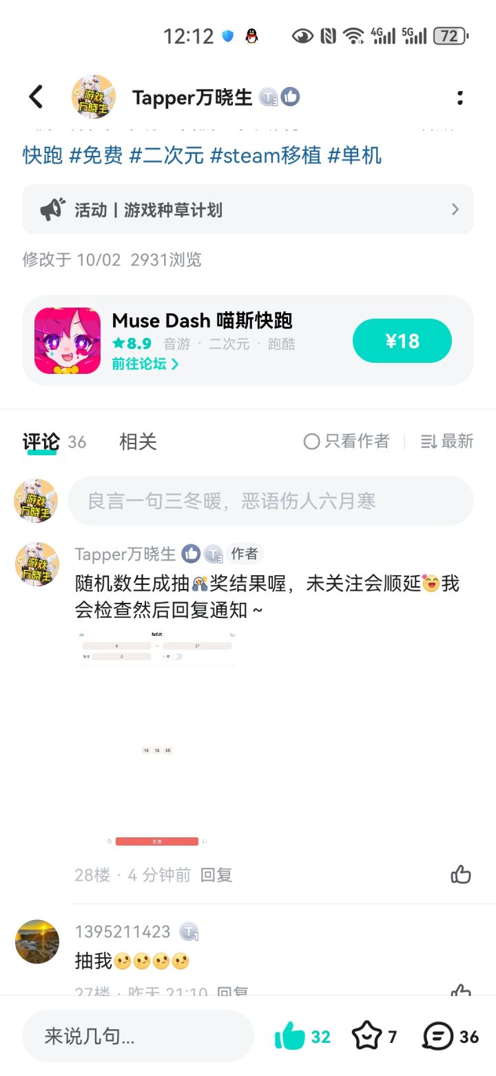 是这样的musedash限免后折扣价3元,我寻思给没领到限免的玩家来个抽奖活动,抽3个游戏激活码6号开奖……结果今天到开奖时间一看它竟然恢复原价18元了不是,说好的国庆折扣呢,原来不持续七天吗今天就结束了??没办法兑现的承诺还是要实现,原价给中奖家人们送礼了我现在心态还好,还好#musedash #音游 #单机游戏 #离谱#买这游戏就亏了