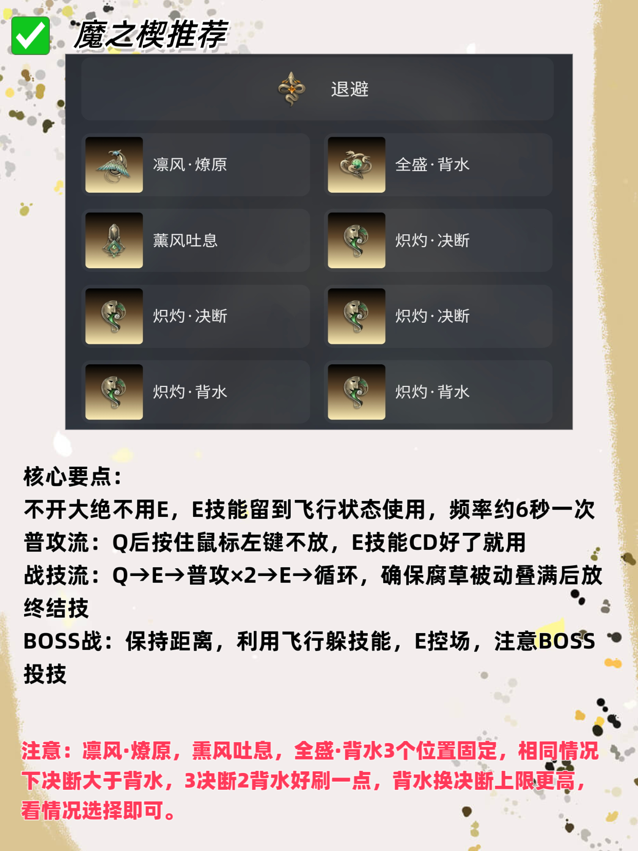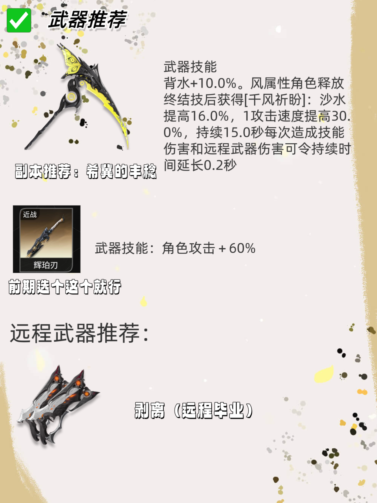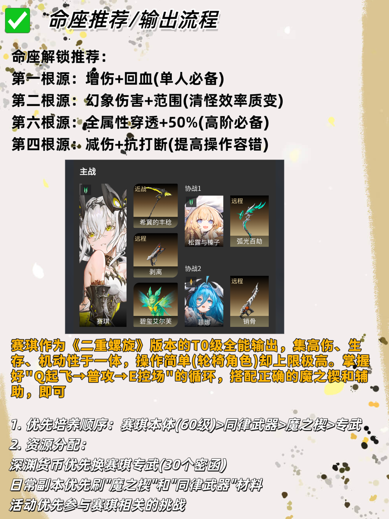 赛琪是T0级风属性输出角色,被誉为"最强轮椅",具有飞行规避伤害和高爆发两大核心优势。1. 普攻流(推荐)适用场景:单体BOSS战、高难副本,输出上限最高核心思路:破茧后按住鼠标左键持续普攻,E技能6秒左右释放一次利用追袭MOD的追加伤害(独立乘区)和鳞粉印记增伤1. 武器选择毕业首选:希冀的丰稔(专武)→提供90%技能威力和背水效果过渡选择:枯朽→主线或密函获取新手过渡