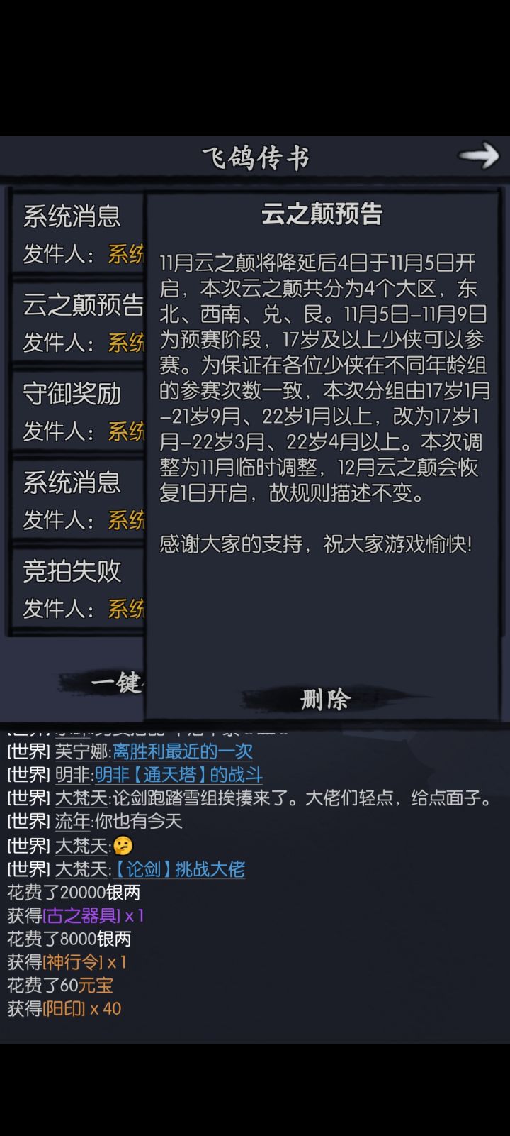 本帖就是交流下云巅的参与薅羊毛小攻略不喜勿喷,友善交流!赛制规则可以看图上左上角问号图标,有相对较为完整的介绍那这里简单归纳下云巅开赛1-5天为预赛,完全随机进组只要保证自己在小组前8就能挺进64强那有人问了,我们组前几名每天元宝刷次数在干嘛?其实是大佬们尽量错开和别组第一提前碰上成为小组第一就可以不提前王对王云赏这里重在参与的少侠们其实拿到64,32强奖励就