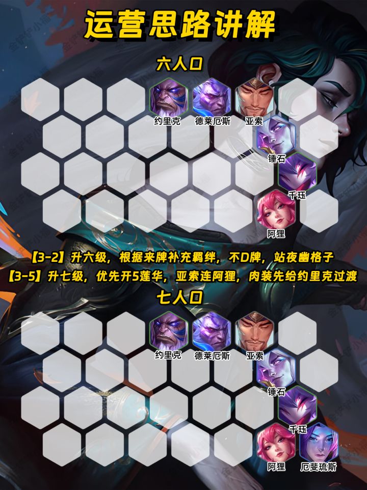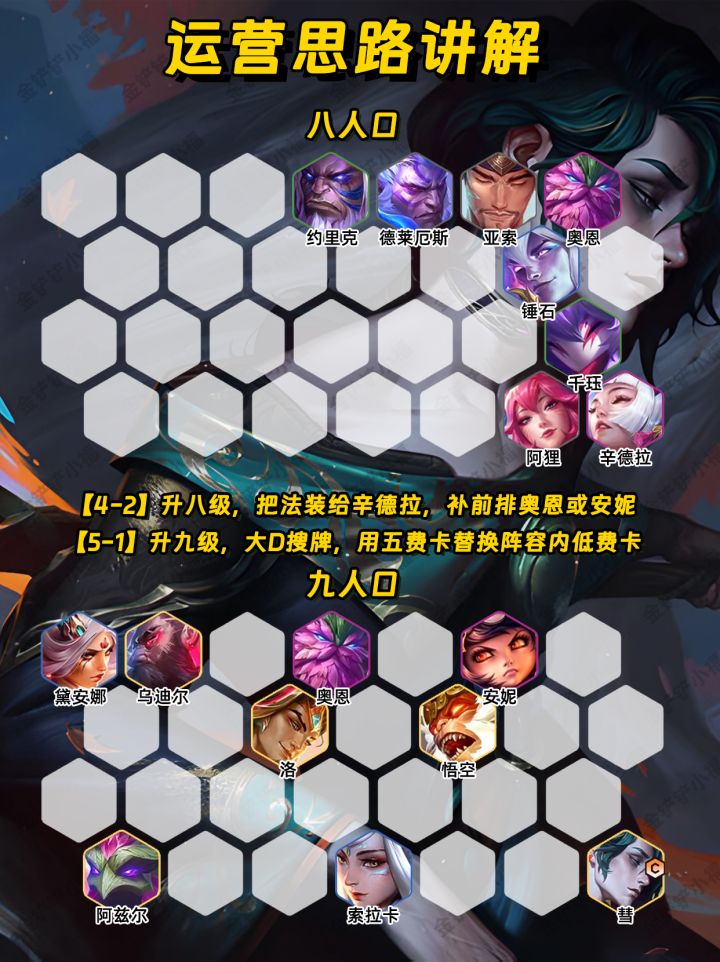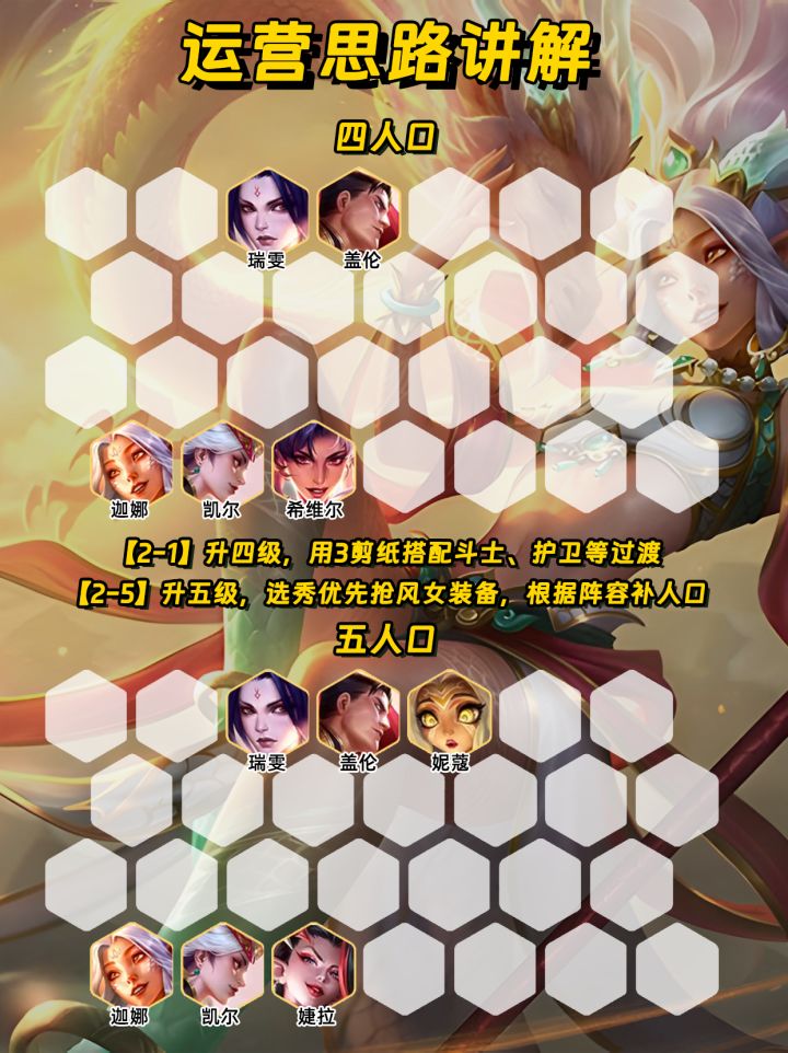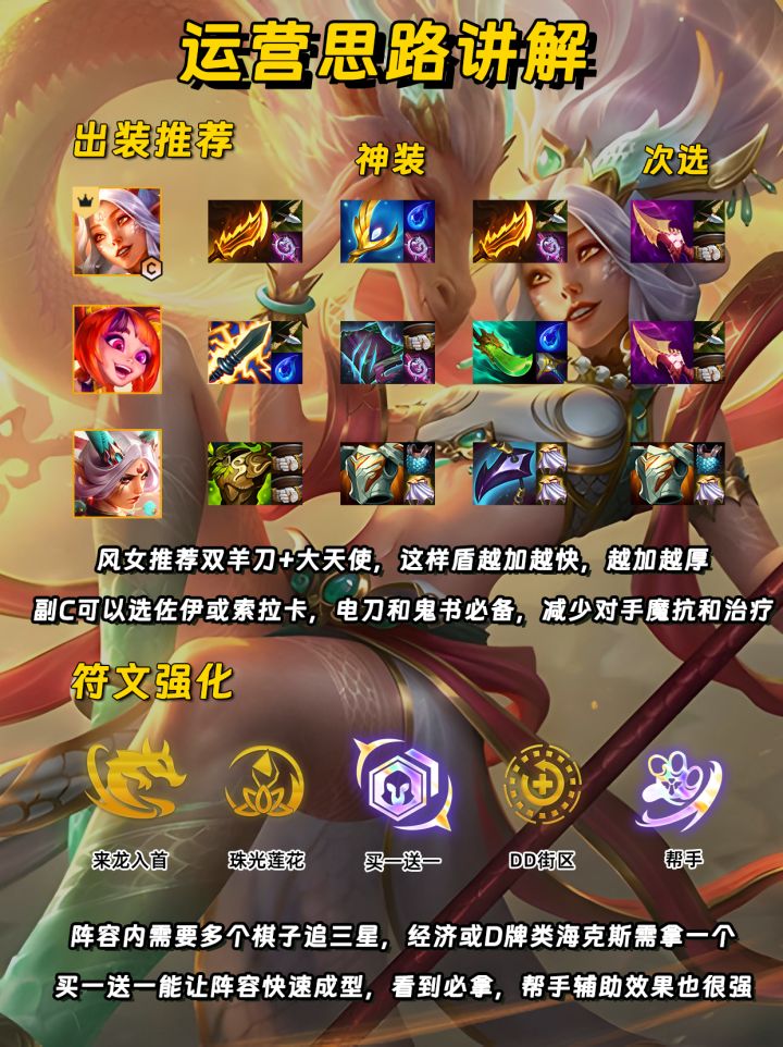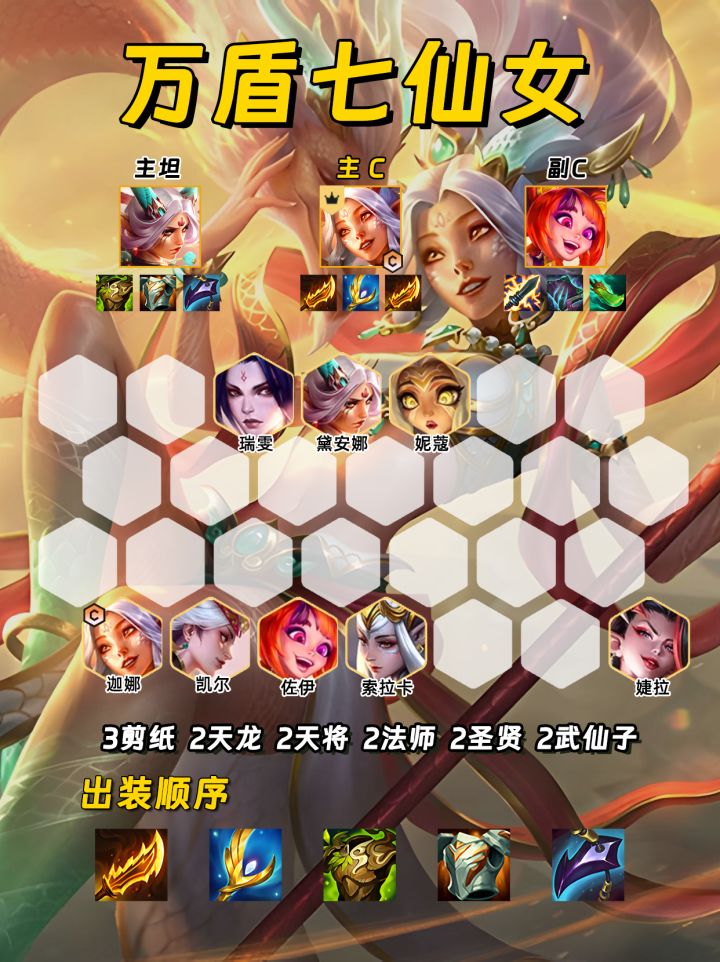 S11也有万盾流风女🌬而且七仙女羁绊搭配的非常完美多个C位可供选择根本不怕烂牌🃏✨过渡思路✨前期用剪纸搭配迦娜或前排斗士护卫过渡阵容需要D出多个棋子三星⭐看到D牌类的海克斯一定要拿❗能帮助阵容快速的成型🧮五级根据来牌补充羁绊🎉3-2升六后,如果质量较差先D二星风女然后卡利息慢追阵容内所有棋子三星🌟优先级:风女>黛安娜>佐伊>索拉卡>妮蔻>瑞雯>婕拉如果有备战席不够大家按照优