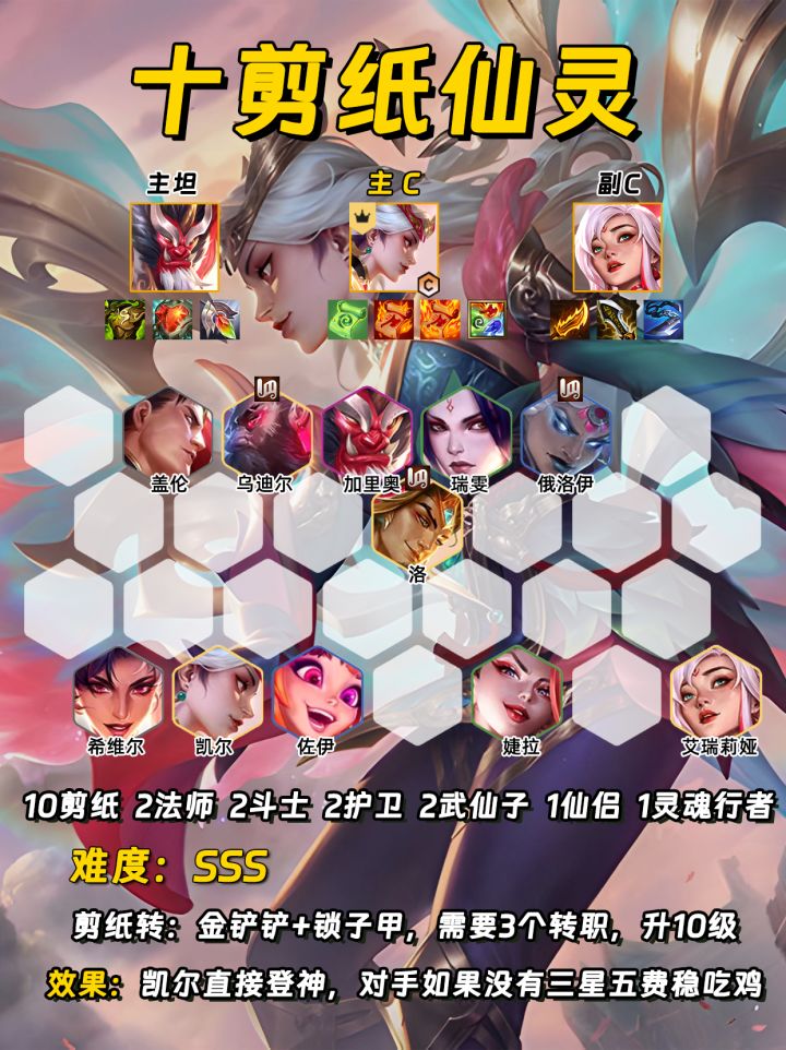 1⃣十剪纸仙灵需要3个转职,升10级成型后凯尔直接登神🧚,对手没有三星五费稳吃鸡2⃣十灵魂莲华需要3个转职,升10级所有灵魂莲华弈子获得300%的每种莲华加成🪷3⃣十山海绘卷需要2个转职,升10级山海绘卷弈子立即变成史诗级🌊,此加成转而提升250%4⃣九夜幽需要3个转职,升9级处决🪓低于40%生命值敌人,每个敌人100%掉落战利品🏆5⃣九吉星需要4个不可合成转职,升9级开