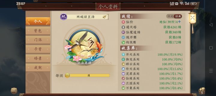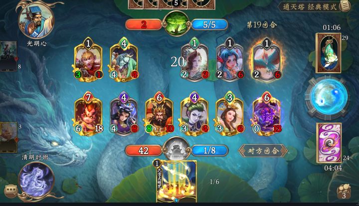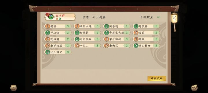 新人刚玩几天,因为金木比较有节奏感,加上没其他卡就玩了这个。 和大家理解不太一样,我喜欢带那两个1费的主角装备,有些赌,但收益特别大。 玉如意给甲子神将带,后期能杀到20多攻且血回满。 黄角在我这套里纯卡手,换成了嫦娥。 加了一生二过牌和护盾过牌。 比丘老人还是有用的,毕竟可以触发1费那个加攻装备。 因为没有稀有卡(那个女娲),就凑合这么玩了。 胜率意外不错,基本光速杀对面。 在天