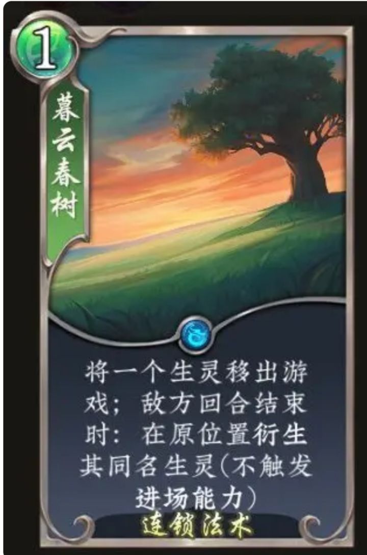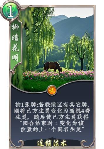 刚好是2个月前DIY的,对比一下效果:1、暮云春树:敌我两用,可攻可防,衍生是满血。奇怪了 策划是忘了加最喜欢的补牌了吧2、柳暗花明:补牌懂得都懂单纯保怪,还是保群怪,可防百鬼,甚至还能抗一波打脸。打出时类似【魅惑】,即先手主动打出只能抽牌。(变化好像之前改成了 默认不触发进场离场效果的,就没写)二者应用场景差不多,大伙来瞄瞄