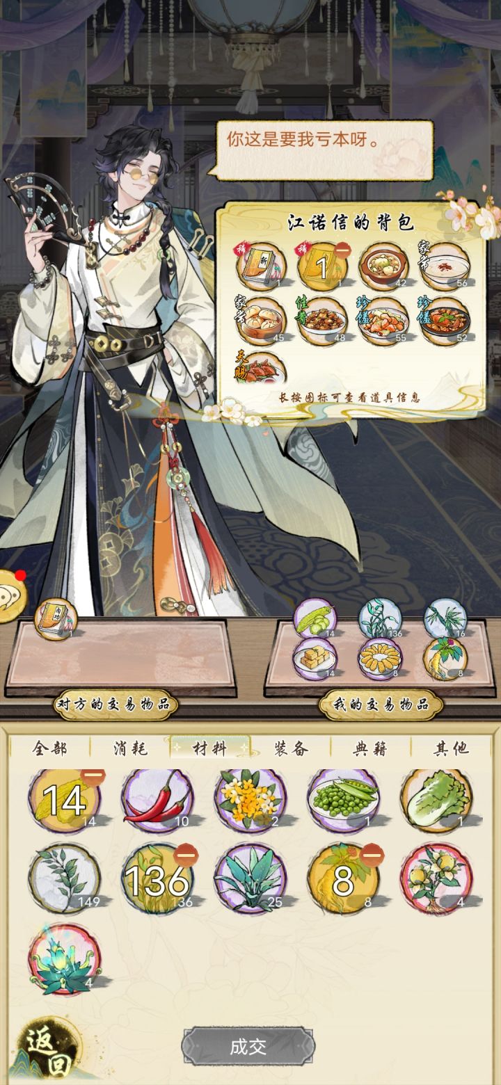 此条视频为新入坑的倒斗人做一个视频,没有讲解仔细看基本都能看懂,淇河大墓给的金大牙角色(金百万),特性交易省10%资源,利用这个特性在跟古董商旅人的交易中可以做到基本白嫖,自己需要什么资源选择成为交易标的,然后用黑折子换就是了,不必纠结为啥是黑折子(铁器一般值点钱数量少点减少操作次数),你用干粮或者水换都成,重点是单独操作,把交易资源消耗降到最低,这里面第一个逻辑金百万的特性已经说了,第二个逻辑,
