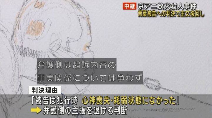 1月25日,据NHK报道,京都地方法院正式判处京阿尼纵火案被告 青叶真司 死刑。青叶真司于2019年在京阿尼办公楼纵火,造成36人死亡,32人受伤,原因是“幻想中京阿尼剽窃了自己的创意”。被告律师辩护称,被告不具备被告刑事责任能力,其行为认知能力受限。法官认为,36人的死亡过于惨烈,他们所遭受的痛苦和恐惧远非文字所能表现,而从犯案前的一系列行动来看,犯人并没有显著丧失是非判断能力。死刑,确定
