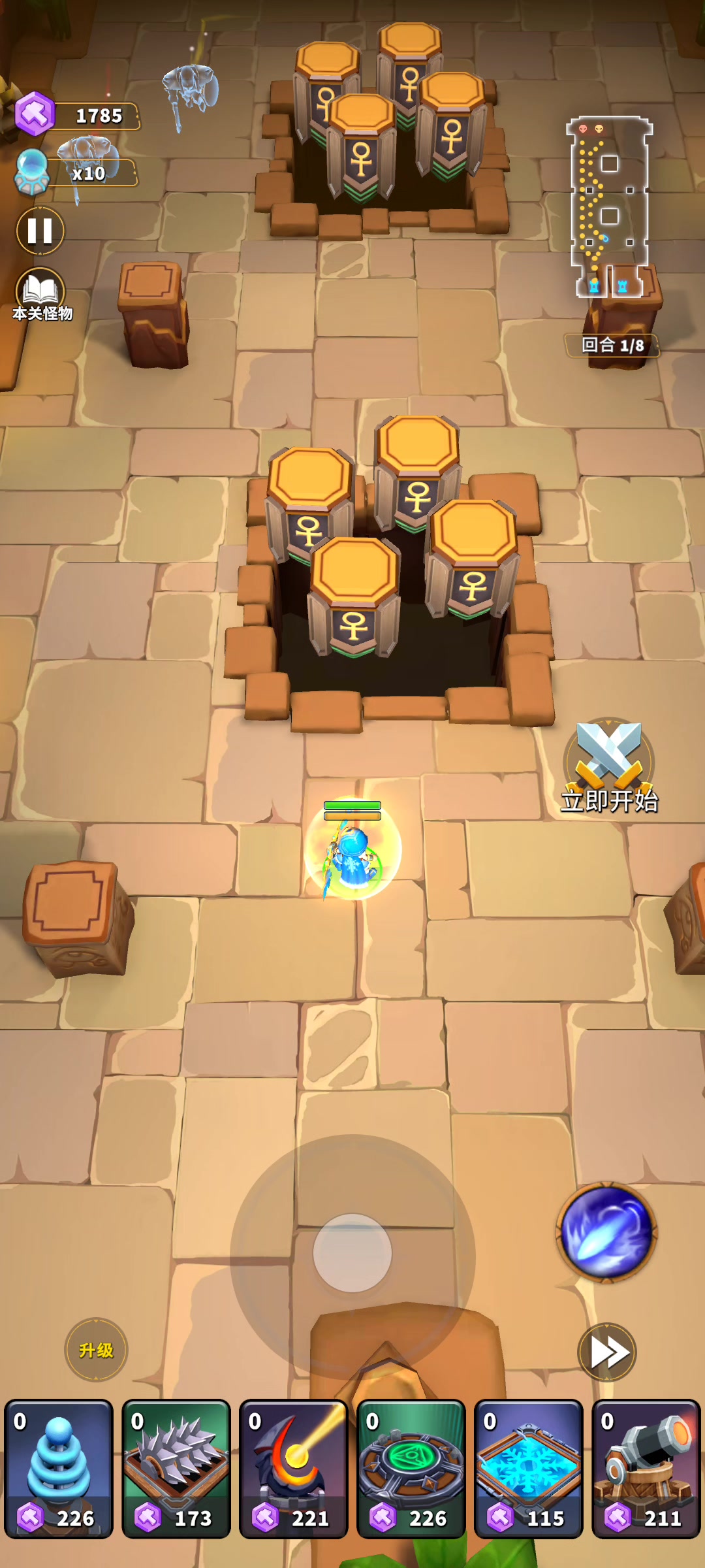 我这个时候已经是战力碾压了,思路就是左上角出怪口一个输出点,右上角一个输出点,英雄站水晶口打鸟,漏怪墓地后补传送,切割三级强化打地面怪和boss,有觉醒火塔的话boss应该随便打了,有觉醒弩配三级强化切割也是可以打boss的#人征塔战 #人征塔战攻略