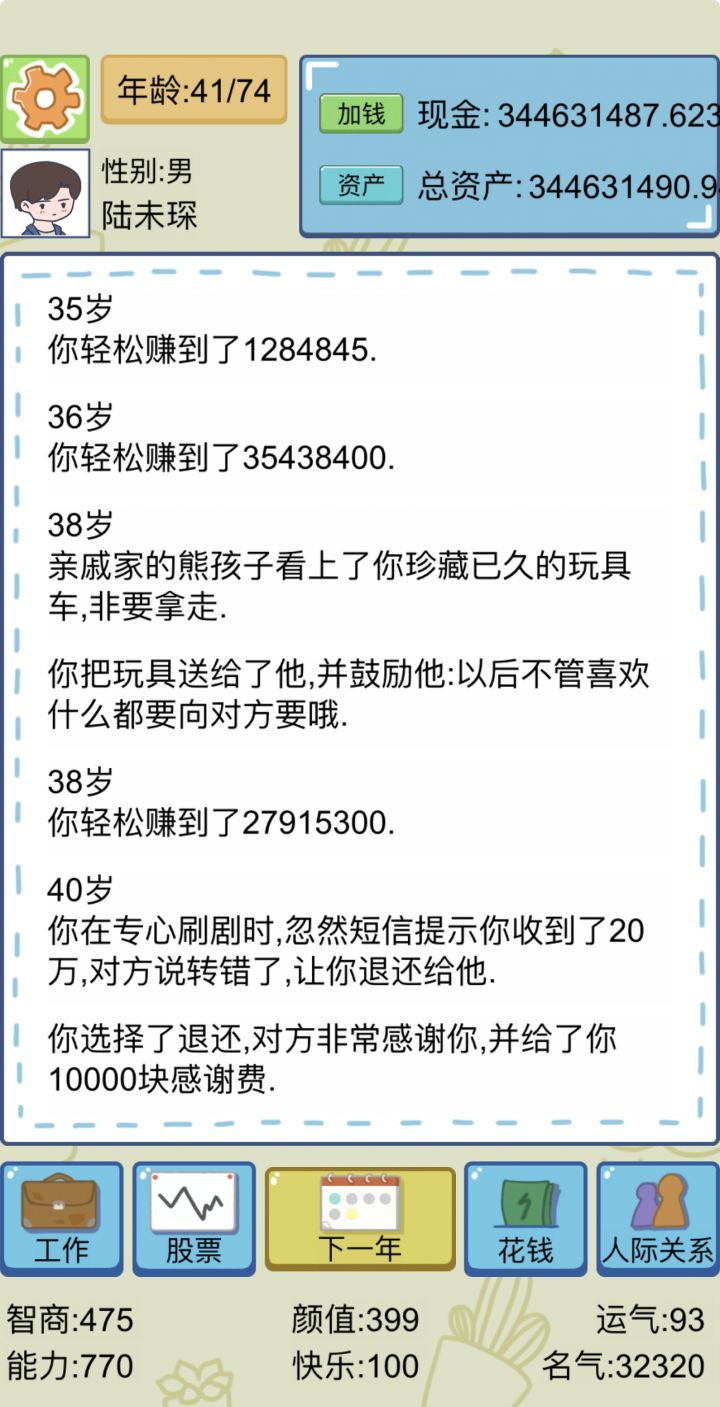 还可以,下午玩的,前期看些广告,本想着靠炒股赚钱发现不太可以,然后就开局选升那个名望到后面考大学找工作,通过视频救助一点点攒钱,到后面有那个根据资产花钱的,就这样钱越来越多哈哈哈不过有一点要说!!!广告太多啦!!!有时候光是点下一年就要看五秒广告!!!过分啦!还有那个传代后为什么不能保留原有家庭啊!!!那个选择结婚的对象太少了!!!来回就那几个!!!希望能多加点有意思的选项之类的。 #浅