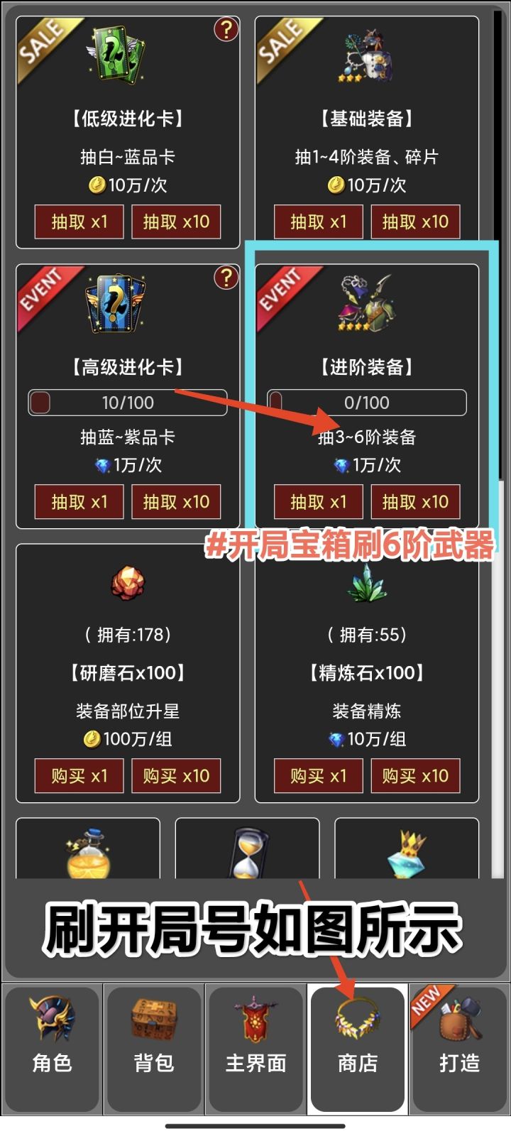 刷开局:在主界面-系统,用礼包码EZLETWVT账号和密码一样 还有新手礼包jhzl666(密码还是jhzl666),加群礼包jhzl999(密码还是jhzl999), 筹够30万钻石开三次10连抽3到6阶装备,最好抽到6阶武器开局。 进化之路:每次升级后,点到打不过为止,这样经验多。 技能升10星:5次靠技能结晶,5次为进化升星。 技能:主动技能尽量用更高阶的,附带水火木暗光等属性的。