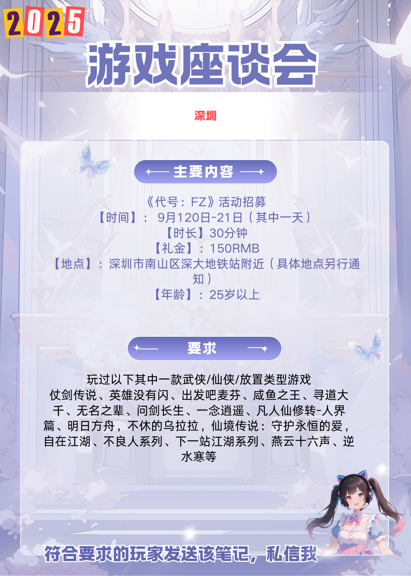 深圳线下活动招募 活动内容:游戏线下体验访谈 年龄:25岁以上(硬性) 时长:30分钟左右 时间:9月20日~9月21日中的任意一天(具体时间另行通知) 活动形式:线下访谈 活动地点:深圳市南山区(具体地点另行通知) 奖励:入选并完整参会会有150 招募要求:玩过以下其中一款武侠/仙侠/放置类型游戏 仗剑传说、英雄没有闪、出发吧麦芬、咸鱼之王、寻道大千、无名之辈、问剑长生、一念逍遥、凡人仙修转