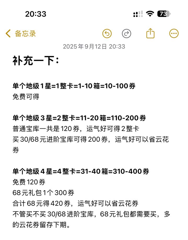 虽然验算过了,但还是要加一句,保险起见自己也算一下,有错一定要告诉我啊。250票少花人民币的之前总金额写错了,已更正注意:如果每次山精游幸的异兽都拿满的话,这次异兽馆会升到上限,可以抓四只但是只能养两只。这次不会加上限了,后续就不清楚了。视频版山精招待教程https://www.taptap.cn/moment/666043328361400161?utm_medium=sh
