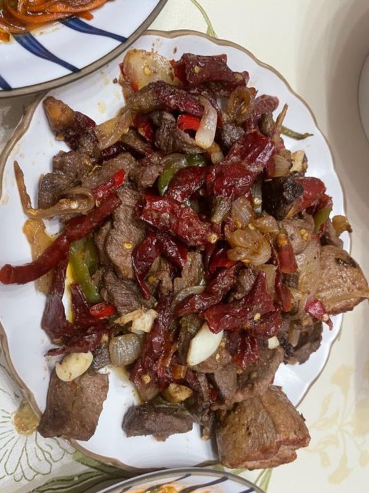#仙山小农食谱共创 菜肴名称:爆炒马肉烹饪食材:马肉×1辣椒×2大蒜×2描述:马肉切片,辣椒切丝,干辣椒切段。蒜拍碎。热锅凉油,放一勺盐放止油溅出来。放入蒜一半、炒软;放入青辣椒,炒一会儿。放入干辣椒,炒一会儿;加生抽、老抽,放入马肉,炒熟,放盐、蒜,出锅。作者:Y游戏账号:284752图片来源:百度