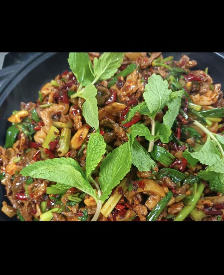 菜肴名称:干锅马肉烹饪食材:马肉*2,胡椒*1,花椒*1,薄荷*1描述:贵州惠水特色小吃。大概做法:马脊肉切丝,加盐,淀粉,料酒腌制。四层油温下马肉滑熟。加入干辣椒,胡椒,花椒,姜蒜,糍粑辣椒,豆瓣酱炒香。下入马肉翻匀,加入五香粉,鸡粉,生抽,香油,芹菜,蒜苗炒熟。炒好的马肉倒入铺好豆芽的锅中,加入芝麻,薄荷即可。欢迎各位仙友御剑飞行前来品尝作者:kvkv游戏账号uid: