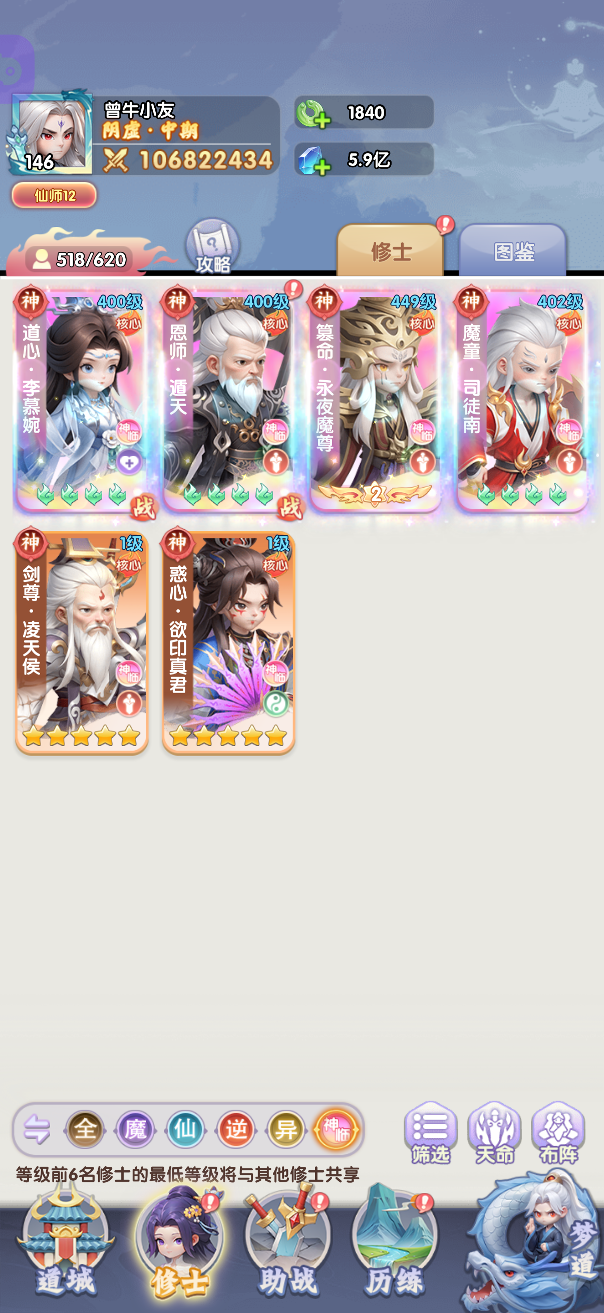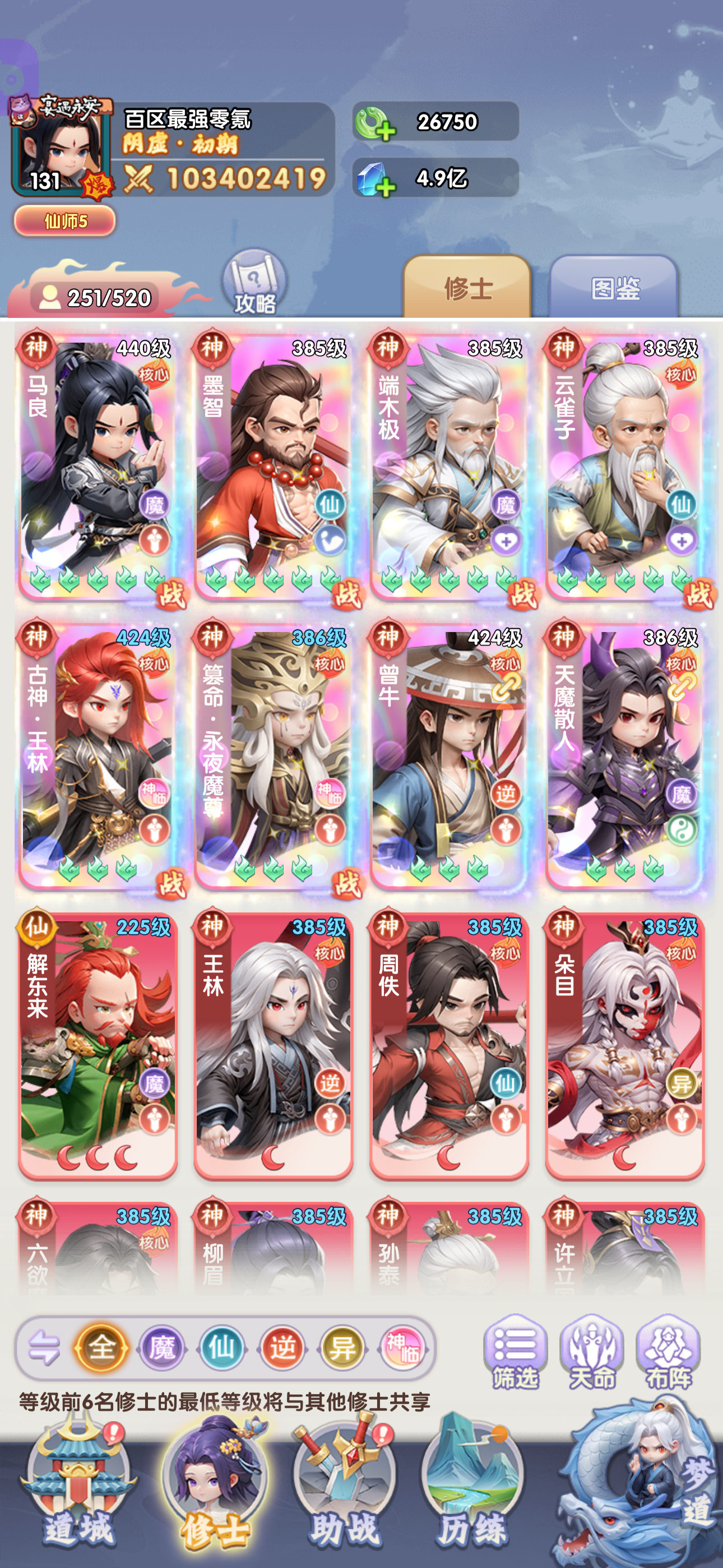 这套阵容兼顾仙逆H5三大玩法,比较适合微氪玩家作为培养目标!且神临卡不需要拉得太高,不需要过度氪金!此阵容有两个比较重要的点!①开服22天开放的禁制系统,上古禁制破军选择优先级最高,古神王林、周轶、周武泰、遁天都需要一张,不升星也可以,后面有了多的破军再给古神王林破军升星!②仙品法宝八极葫升星优先级最高,遇到自选法宝箱子,升八极葫大于激活其他法宝!神品法宝昆极鞭也是升星大于激活其他法宝!不然有墨智