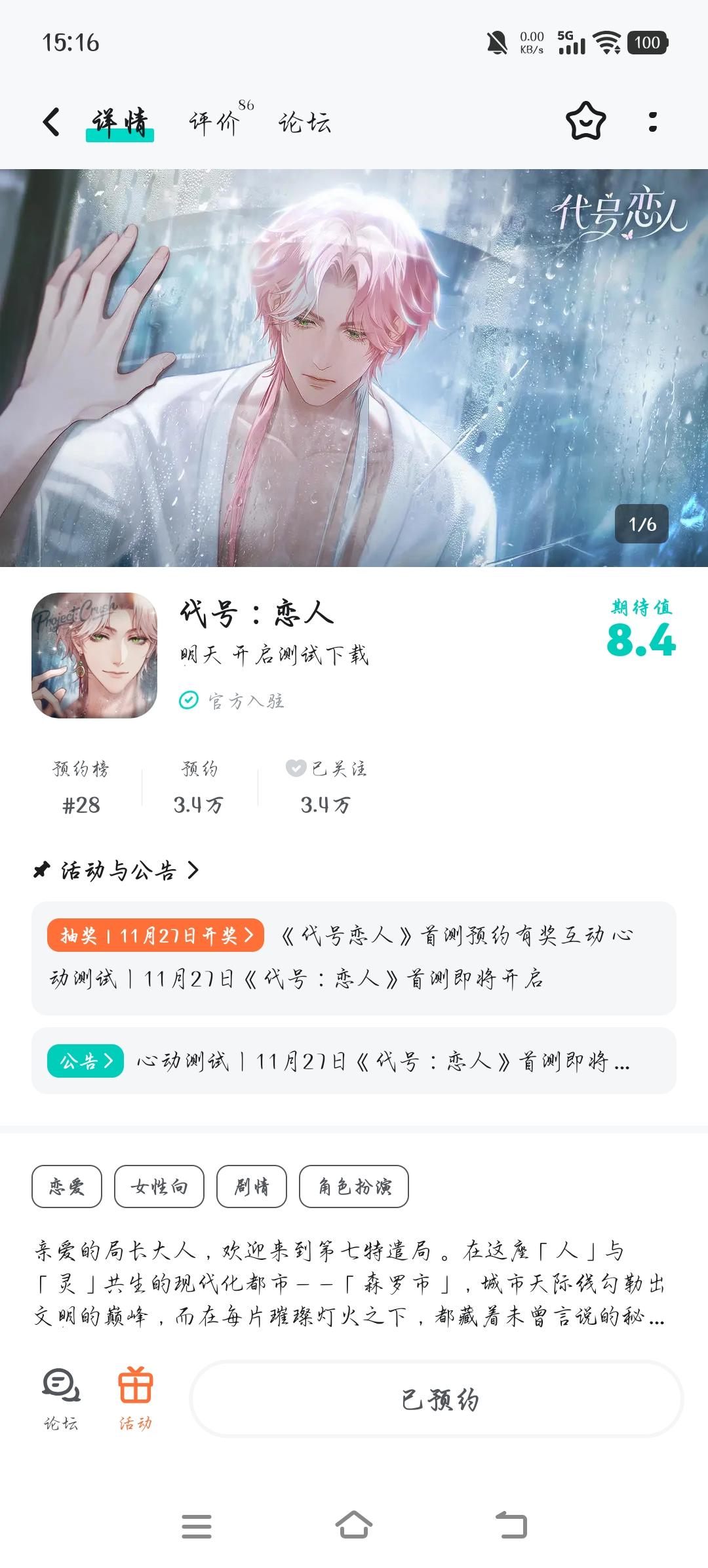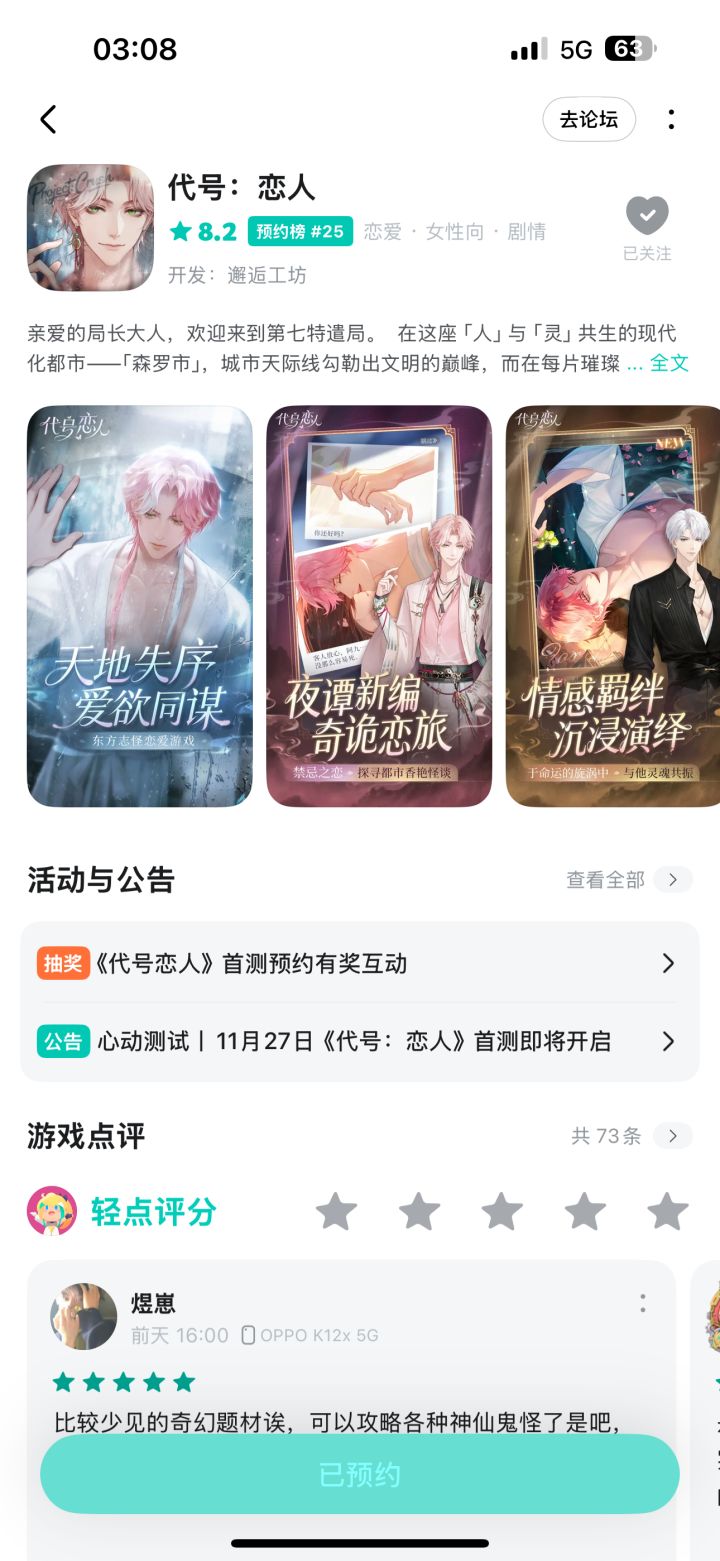 在霓虹与阴影的交界处,那些被时光掩埋的传说,正重新浮出水面。在这个夜晚,奇遇、秘闻与悸动将次第展开,交织成浪漫迷局。天地失序之时,宿命契约已然牵绊,与他的每一次奇幻邂逅,都是千年辗转的约定。《代号:恋人》将于2025年11月27日正式开启「心动测试」,局长大人,这趟羁绊之旅即将启航,光影深处,或许仍藏伏笔。 -- 预约有奖互动 --➤参与方式:关注并预约游戏,同时在评论区晒出你的预约截图