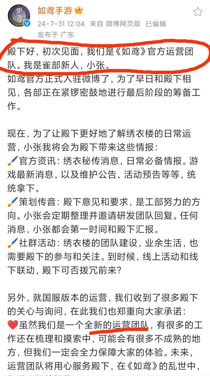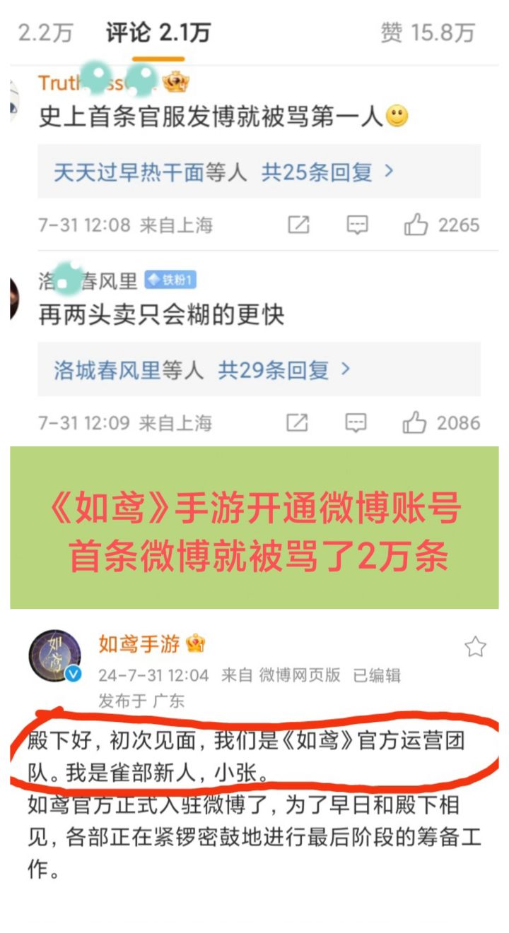 7/31号中午,《如鸢》手游官方运营团队,发布了开通账号后首条微博,于是被骂了2万条❗❗❗《如鸢》官方表示,正式入驻微博,且各部正在紧锣密鼓地进行最后阶段的筹备工作据悉,《如鸢》于7/22号获得了游戏版号这估计是第一个“首条微博就被骂”的游戏官方了吧不知道大家怎么看?#今天游戏圈发生了啥 #游戏资讯 #如鸢 #代